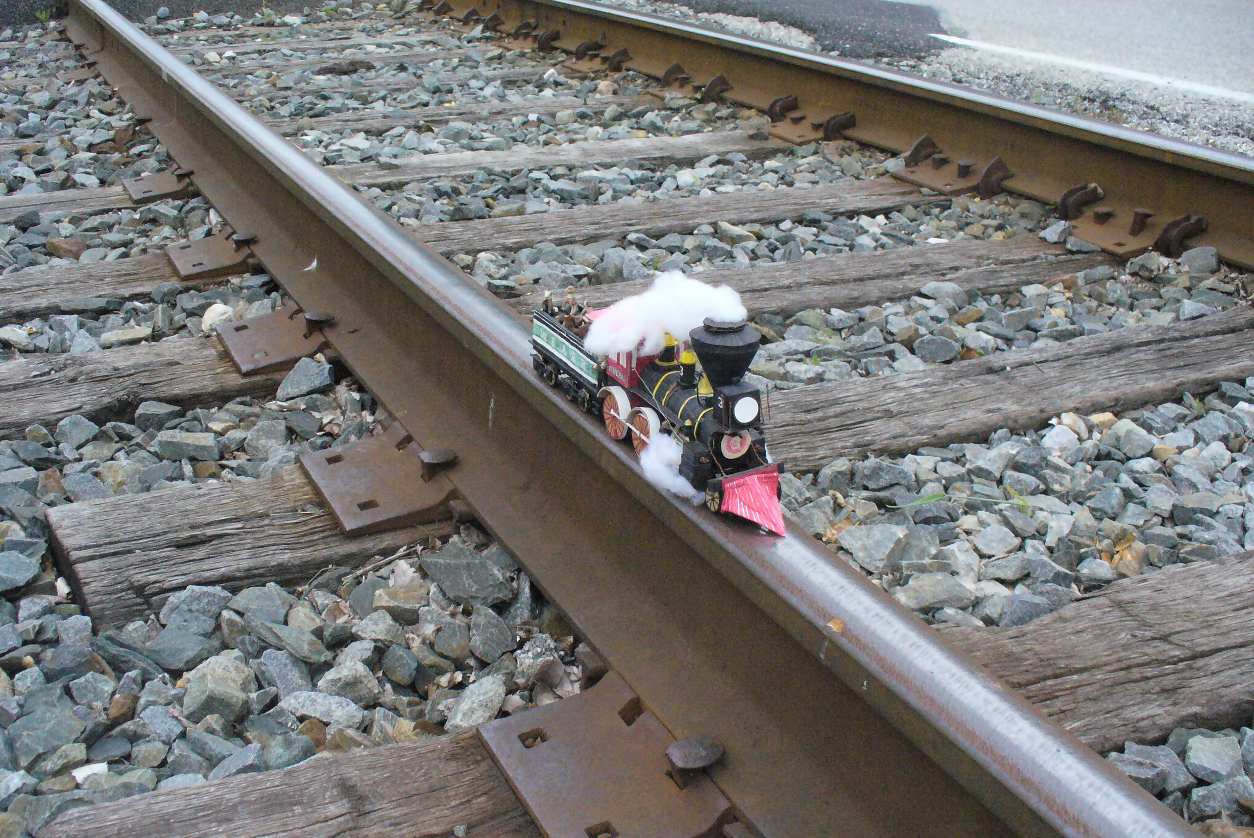 Perhaps the trickiest part, believe it or not, was figuring out where to put which locomotive. With cardboard trains and an old track, the imperfectly aligned wheels did not always line up with the wavy rails where we wanted to place the engine. But there might be another section of track where the misaligned and the wavy matched. We tried the locomotives on this end and that, added the boxcar, sorted it all out, cut the board into two (a longer piece for the Texas and boxcar, and a shorter for the General)—and then when all was finished, both locomotives decided they didn’t like their designated ends of the track! So, we spent more time, putting the Texas on one end of its board, then the other, then farther forward, farther back, etc., and then repeating the process with the General. At last, we could glue the locomotives and boxcar permanently to the track.