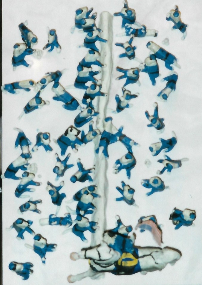 As with “Come On, You Wolverines”, revamping old clay cats involved cleaning decades of grime off of their faces and uniforms. With them being old, stiff, non-hardening modeling clay, lots of arms, legs, tails, and even heads fell off, so we did quite a bit of gluing.
