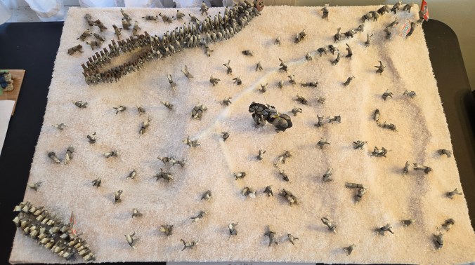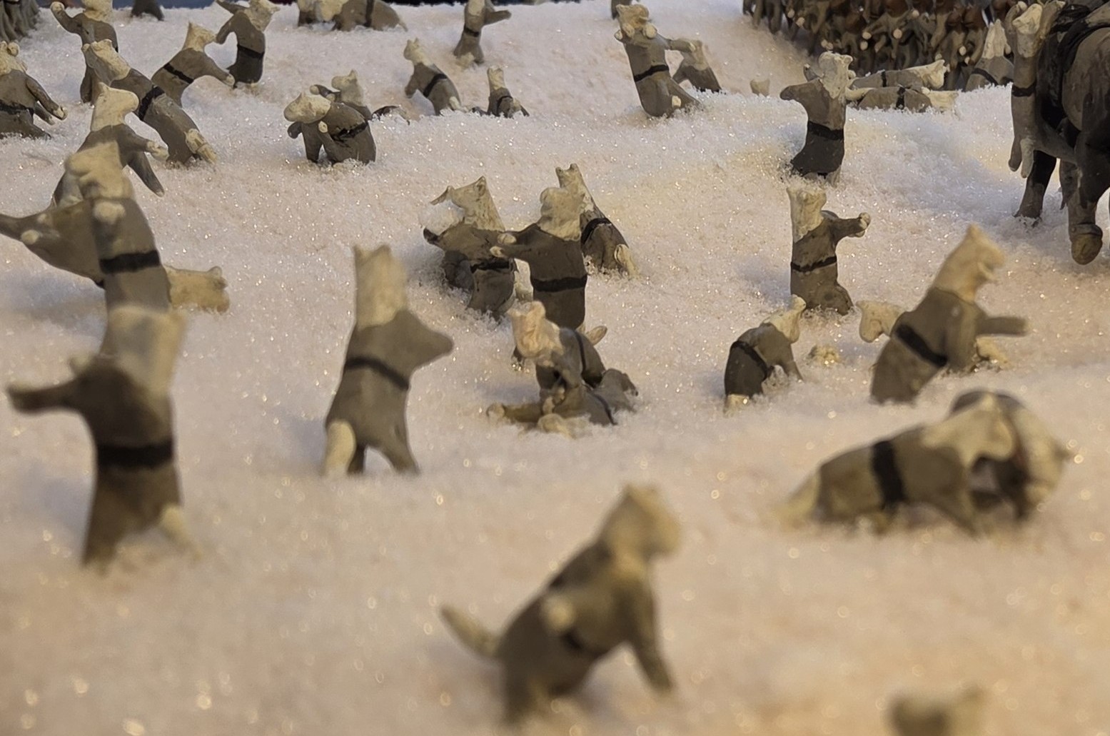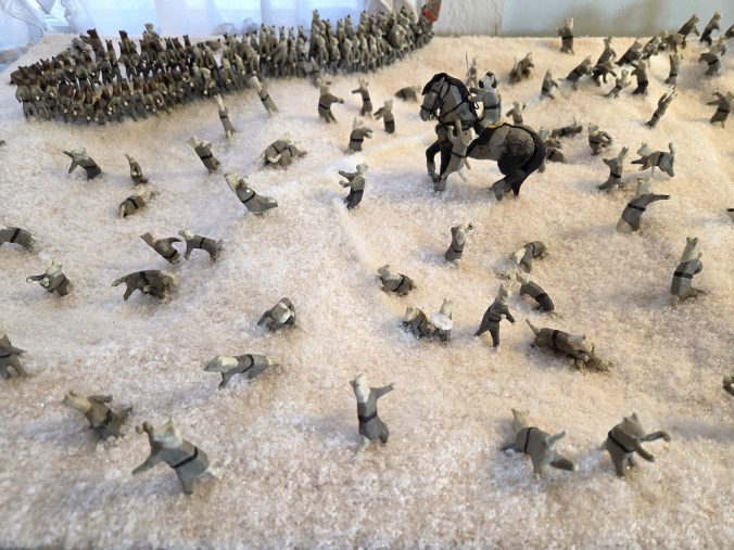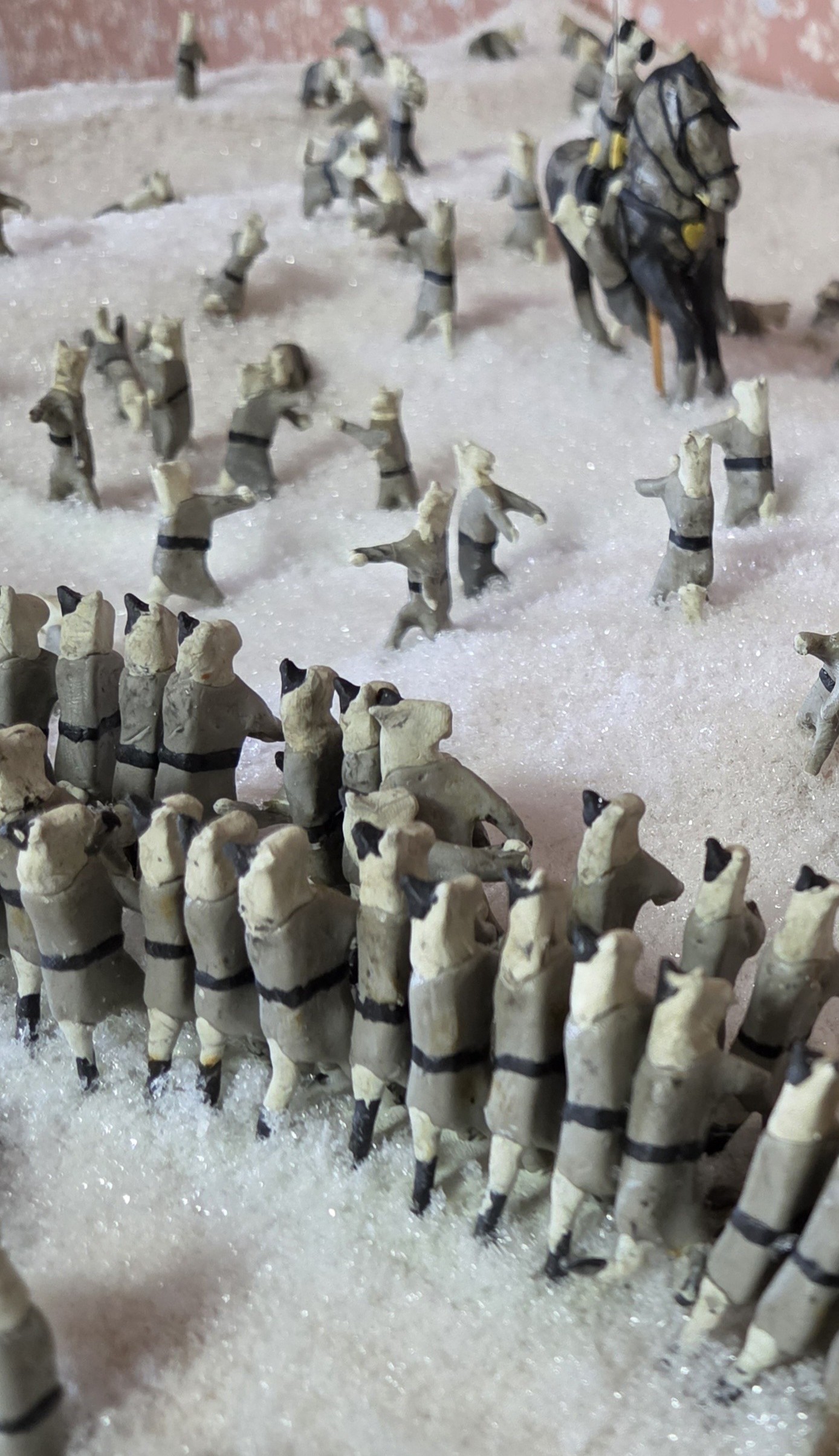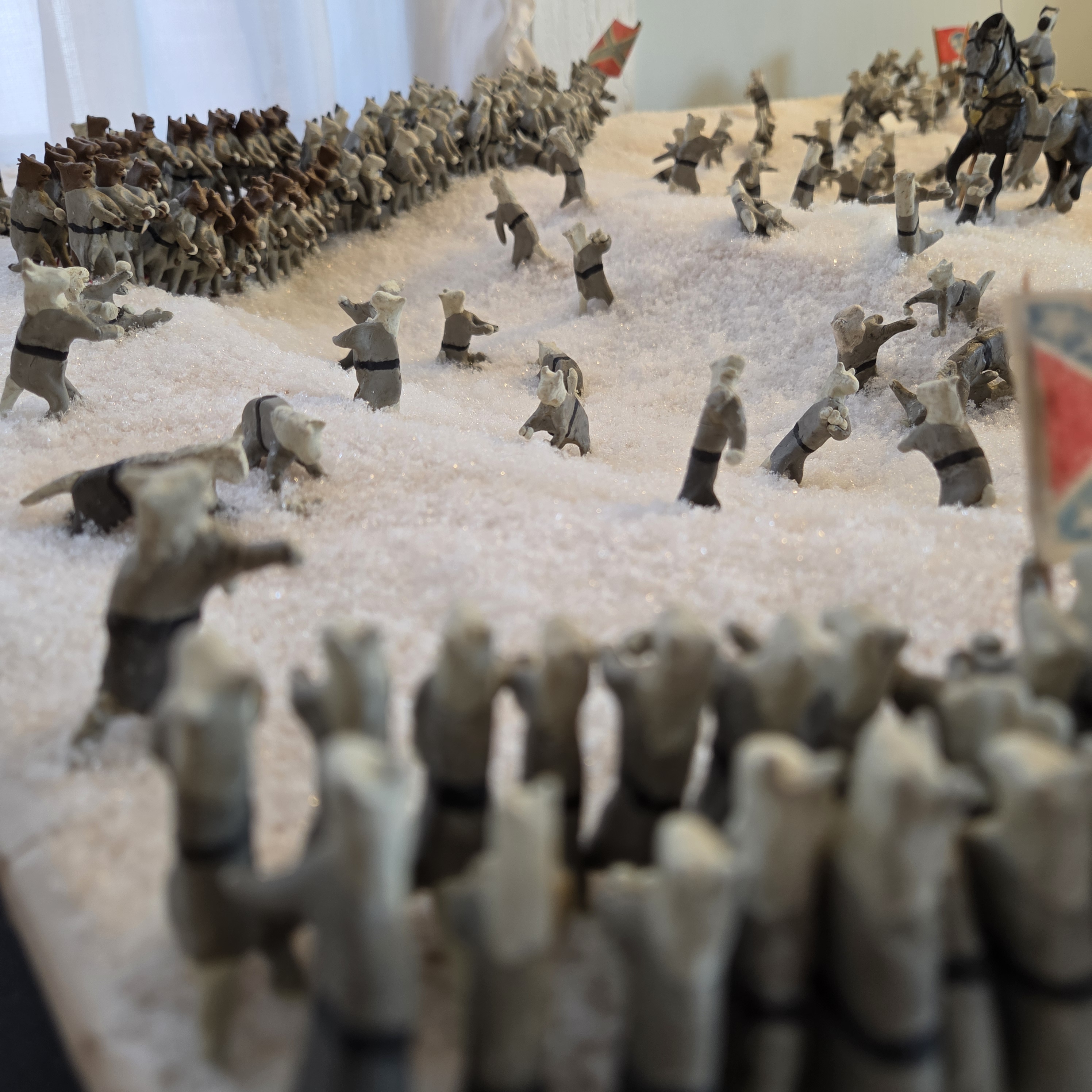The main change, however, was creating a new base and installing new “snow.” We took the opportunity to add a little topography, too. Rebecca began gluing the cats onto the base, keeping the basic layout of the original diorama. And then, Ruth realized the charging cats were in a single rank! Civil War soldiers fought snowball battles with the same formations and tactics as a real battle, so they would be in the double ranks that Napoleonic tactics dictated. So, we had to take up the glued ranks and combine them. That would have been a big mistake to overlook! It just goes to show that even if an old diorama is loosely based off of a story—as opposed to detailed accounts and maps—we still need to pay attention to the details and check if they need to be updated for general accuracy.