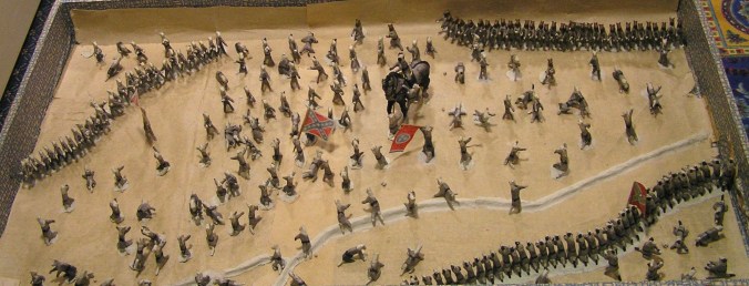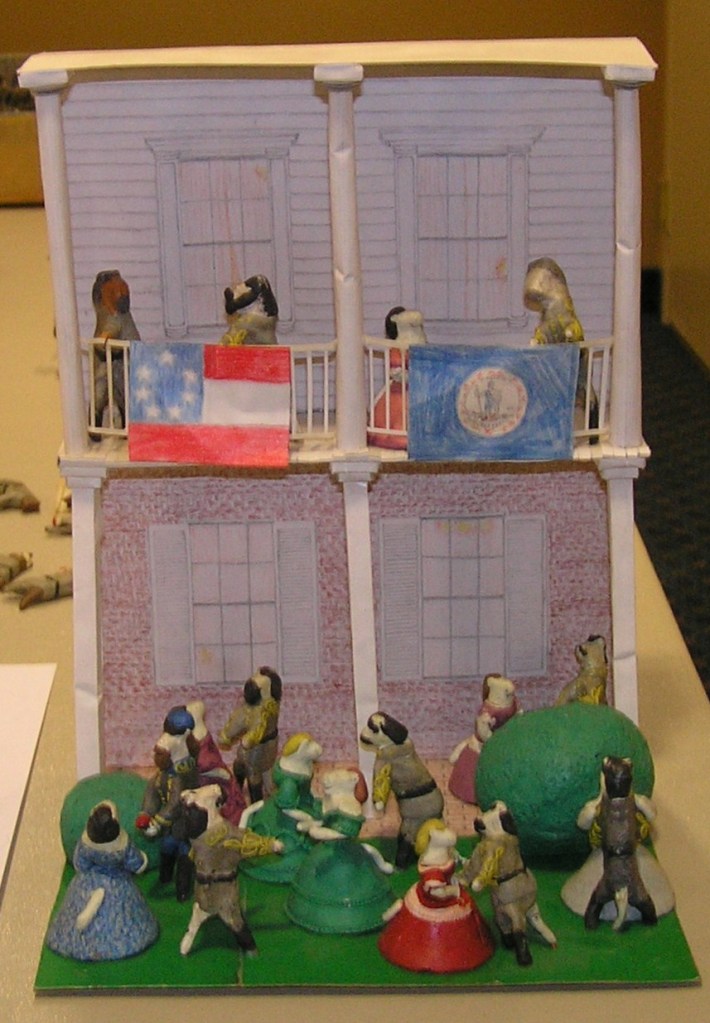 The story of Gen. Patrick Cleburne joining in a snowball fight is one that just begs for a diorama. How can you pass up a story where soldiers have to discuss whether or not to throw their general into a creek? On July 29, 2000, we began making our current version with 2-inch tall Confederate cats under Gen. Cleburne. By July 2003, the diorama was set up in a large wooden tray. The snow was white paper, and each cat had a white clay base.