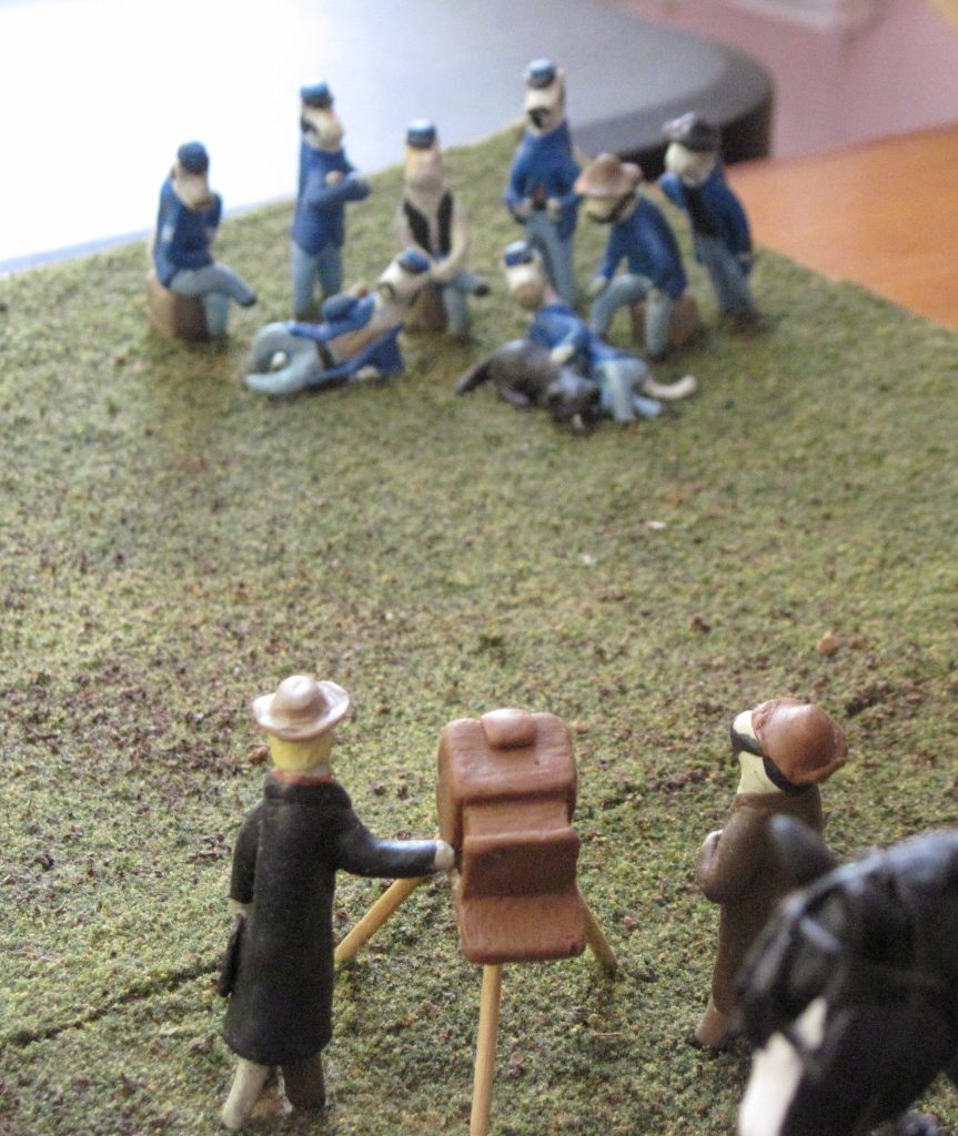 We are excited to have one more diorama showing the lighter side of the Civil War. Because the human interest stories of the war are what has always caught our interest, we enjoy sharing the fact that even though “war is hell,” the individuals involved were men and women just like we are, and they enjoyed fun, humor, and laughter just as we do. So, stop by and check out our Snowball Battle (if you’re tired of snow, feel free to come in July or August when you’ll be glad to think of snow days!), and while you are here, make sure to find our other non-fighting scenes: the Union Ball, Confederate Ball, and photographer.