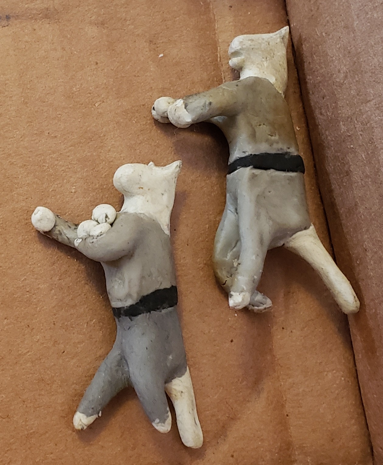 As with “Come On, You Wolverines”, revamping old clay cats involved cleaning decades of grime off of their faces and uniforms. With them being old, stiff, non-hardening modeling clay, lots of arms, legs, tails, and even heads fell off, so we did quite a bit of gluing.