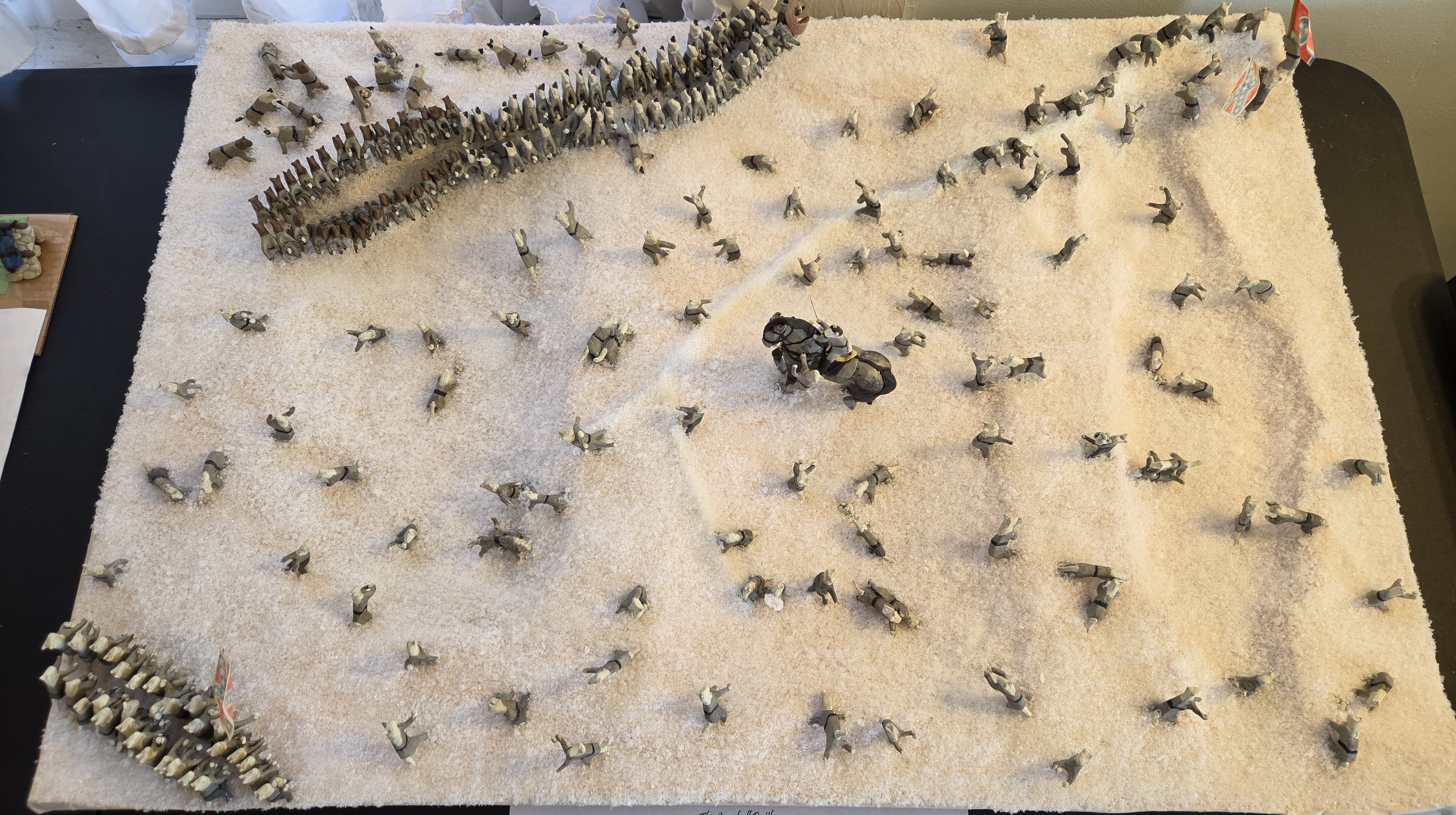 The story of Gen. Patrick Cleburne joining in a snowball fight is one that just begs for a diorama. How can you pass up a story where soldiers have to discuss whether or not to throw their general into a creek? On July 29, 2000, we began making our current version with 2-inch tall Confederate cats under Gen. Cleburne. By July 2003, the diorama was set up in a large wooden tray. The snow was white paper, and each cat had a white clay base.