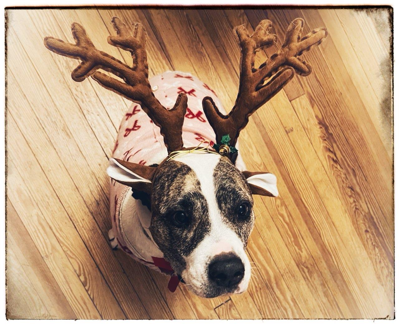 Last year, Santa found himself in trouble again, and the cats had to rely on Joanie and her nose for cookies to save the day! We would like to report that Santa has not forgotten Joanie’s help, and as a reward for her services, a few days ago he made her an Honorary Reindeer!!