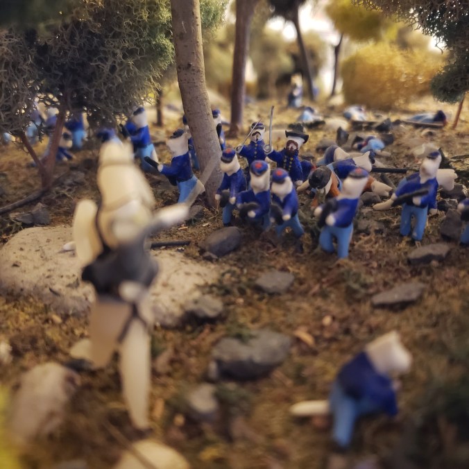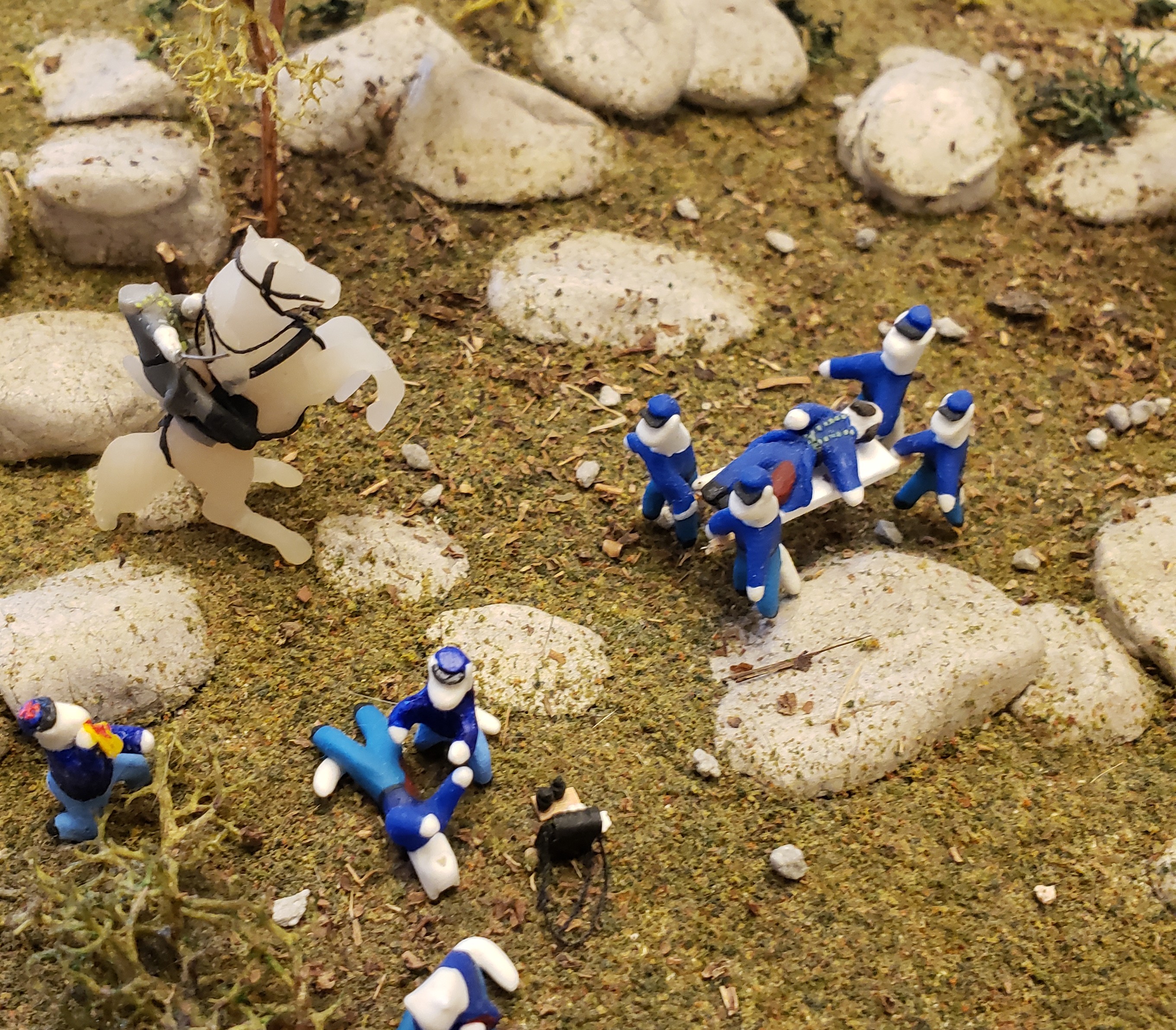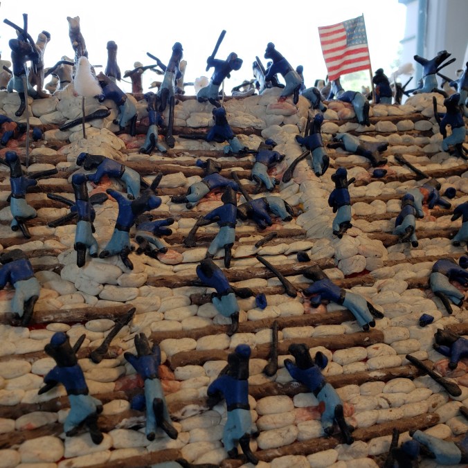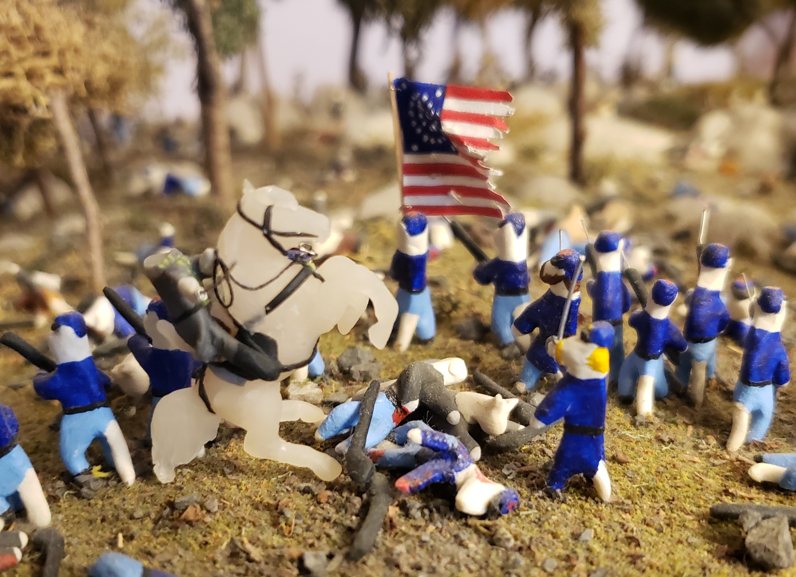 Cat 9,000 is Col. Strong Vincent, installed on the diorama on July 2, 2022. Nearly two years would pass before we finished the diorama in February 2024, but it was getting closer! The ground cover was (finally!) finished, and we had just begun to install Hazlett’s battery.