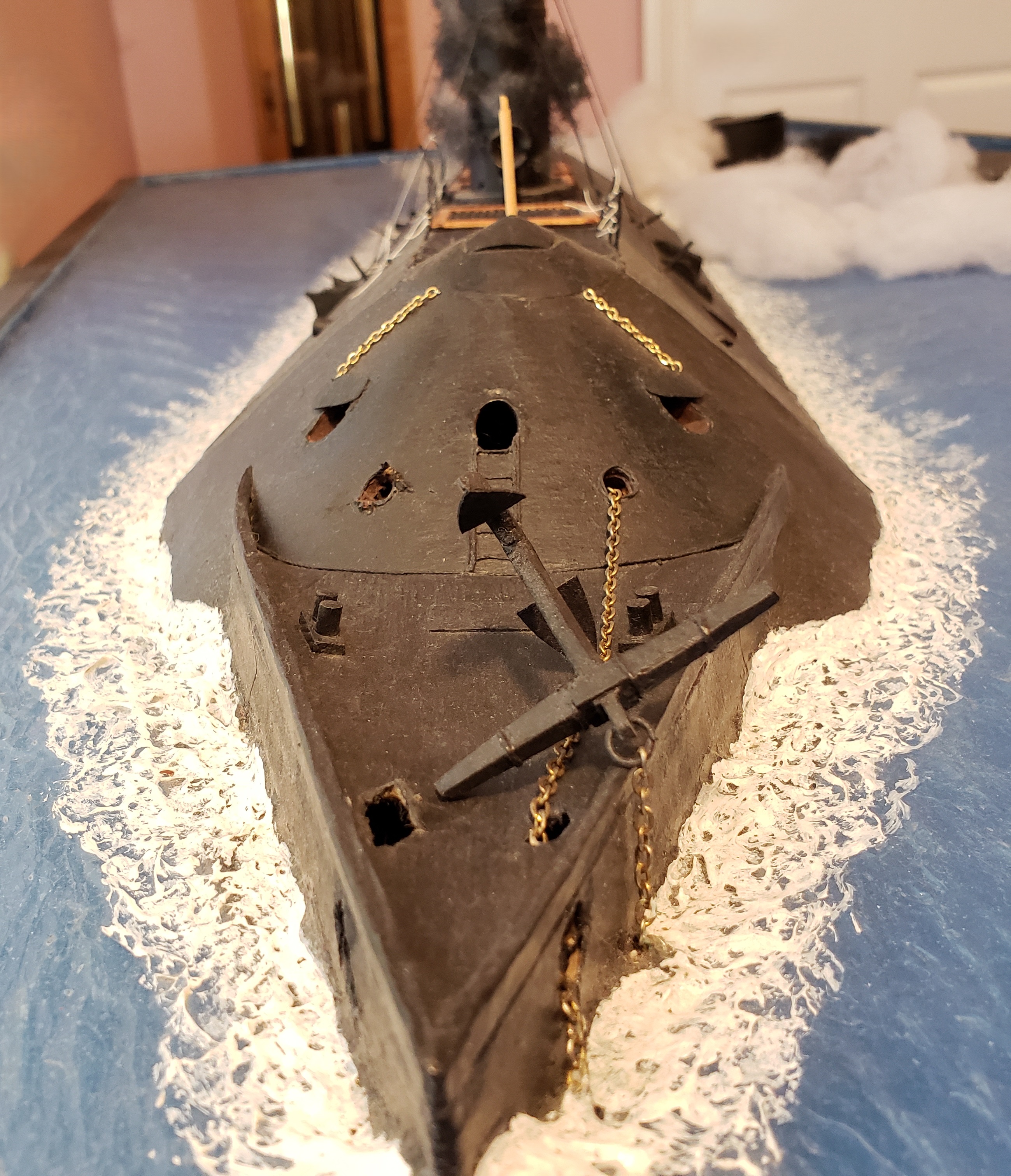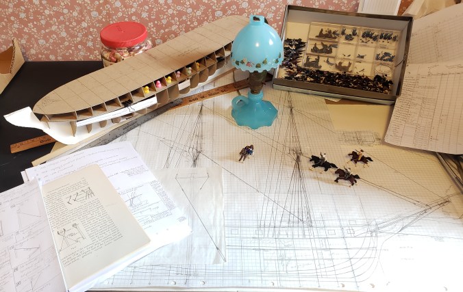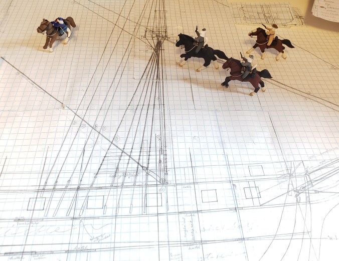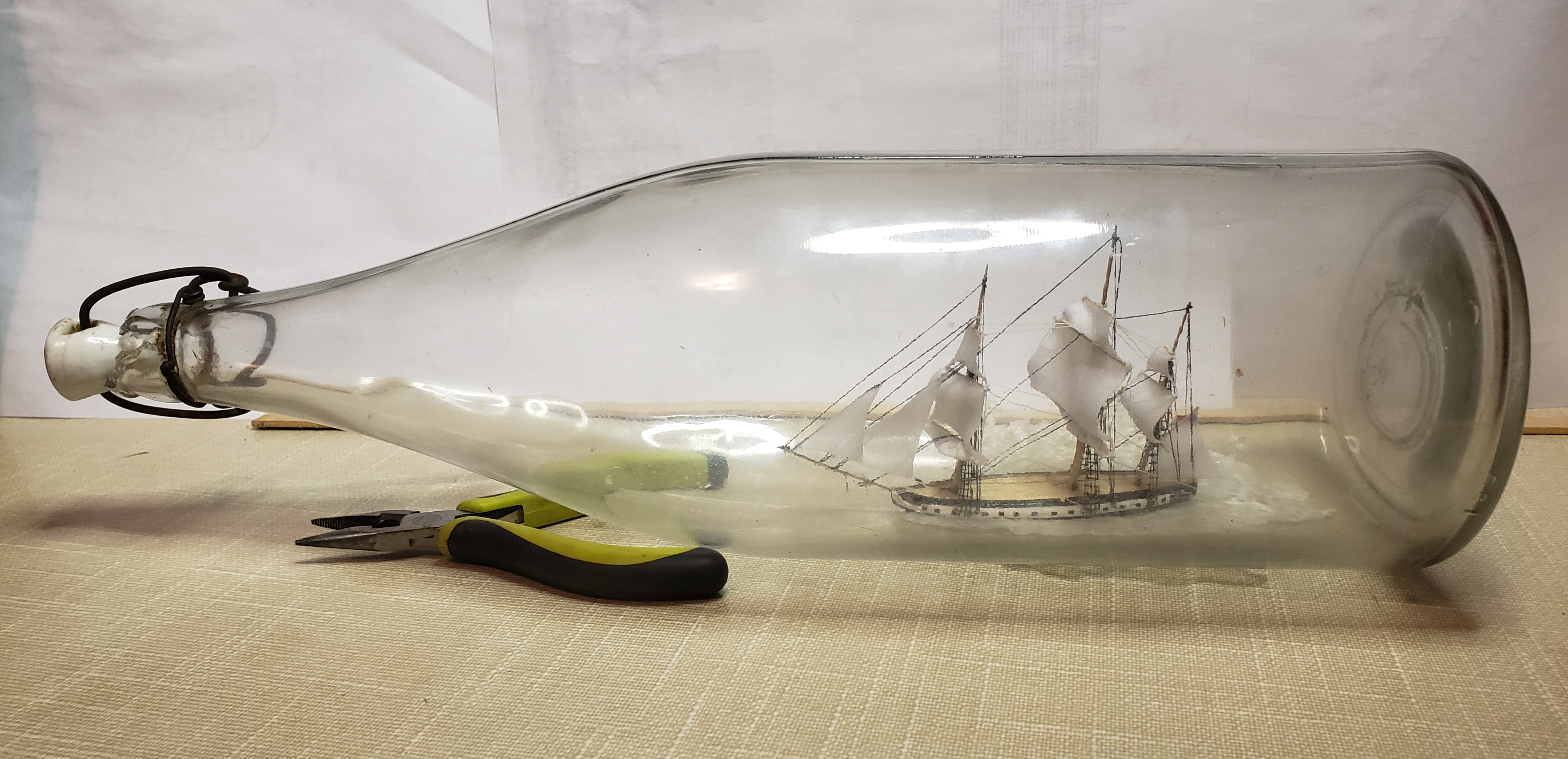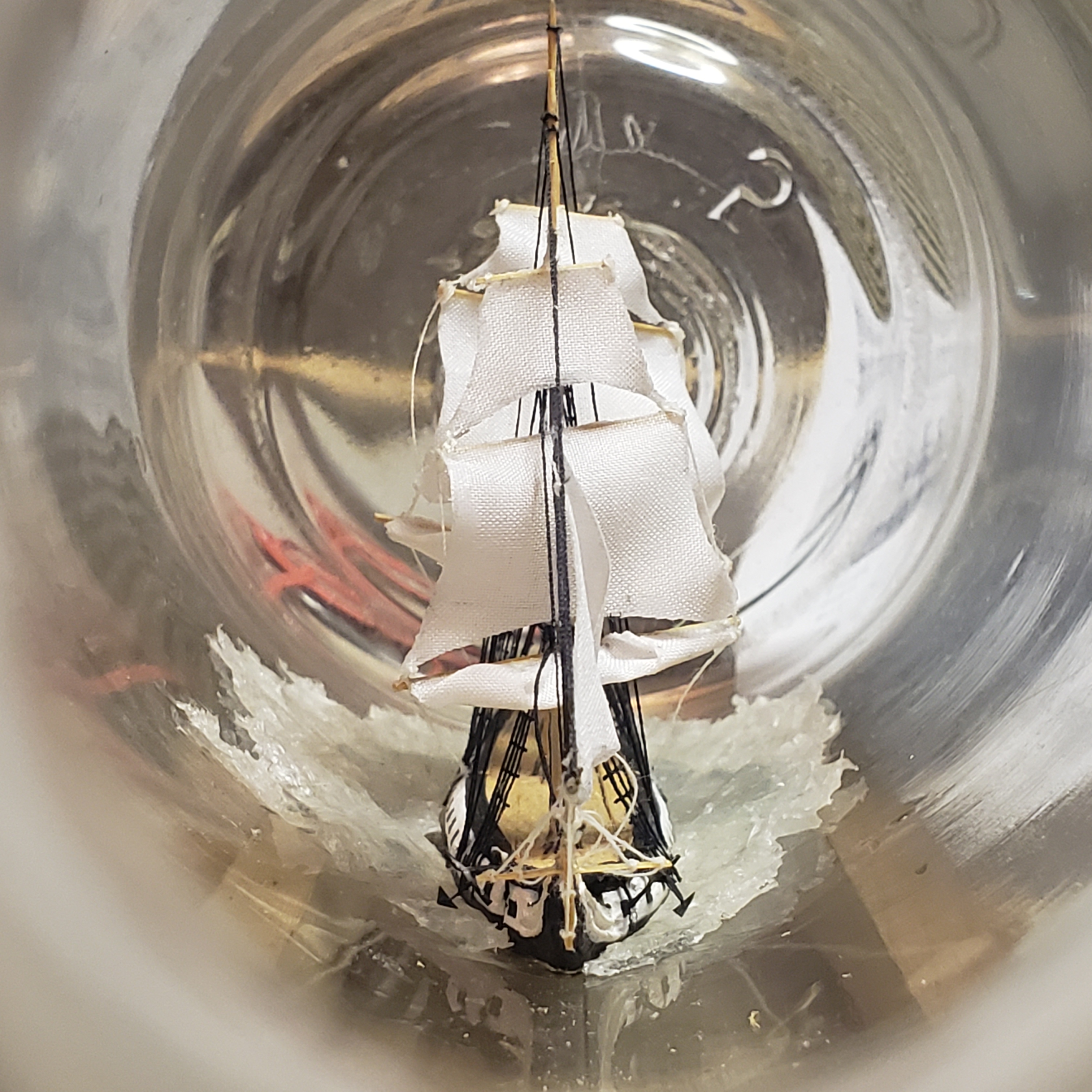 Instead of dots on pants, Rebecca’s nuttiness consists of…scratch-building ships in bottles. At Civil War Tails, you will see USS Cumberland in a bottle she found in Civil War Tails’ basement. In order to make the ship large enough to fill the bottle, she made the hull in three sections that could fit through the bottle’s mouth (as long as nothing, not even a thread, sat between the largest fighting top and the deck). She then had to glue down the shrouds and stays inside the bottle. At this point, Ruth’s mind explodes and she goes and makes samurai!