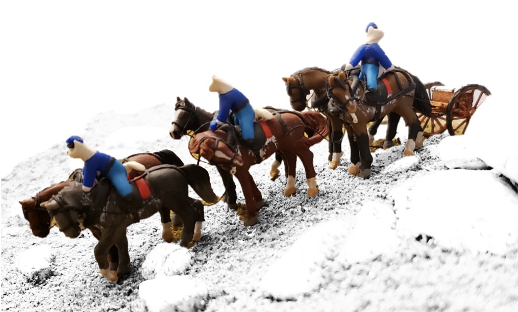 “Don’t worry,” the cheery voice of Pvt. Quinlan Sullivan piped up. “We’ll have you out and on your way in no time!” His team of artillery horses trotted up to the sleigh. Artillerycats unhitched the exhausted, sweaty reindeer, and Sullivan began backing his limber towards the sleigh.