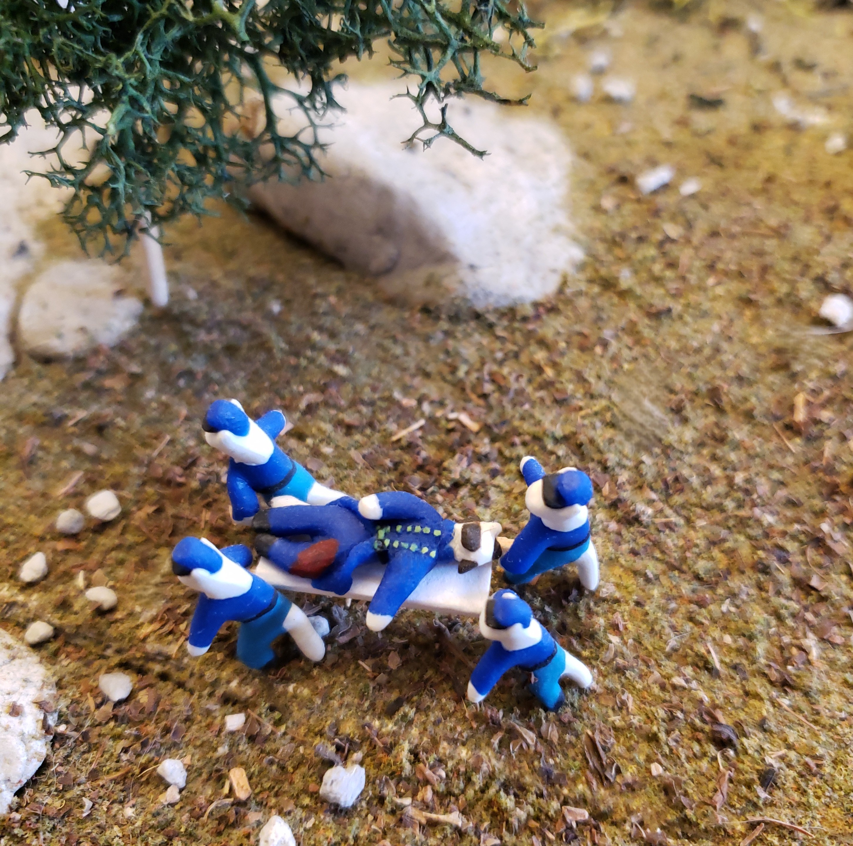 Just in time to avoid capture, he remembered that he is a neutral party in the diorama fighting, and so he went to help direct Cat 9000’s stretcher-bearers to the aid station.