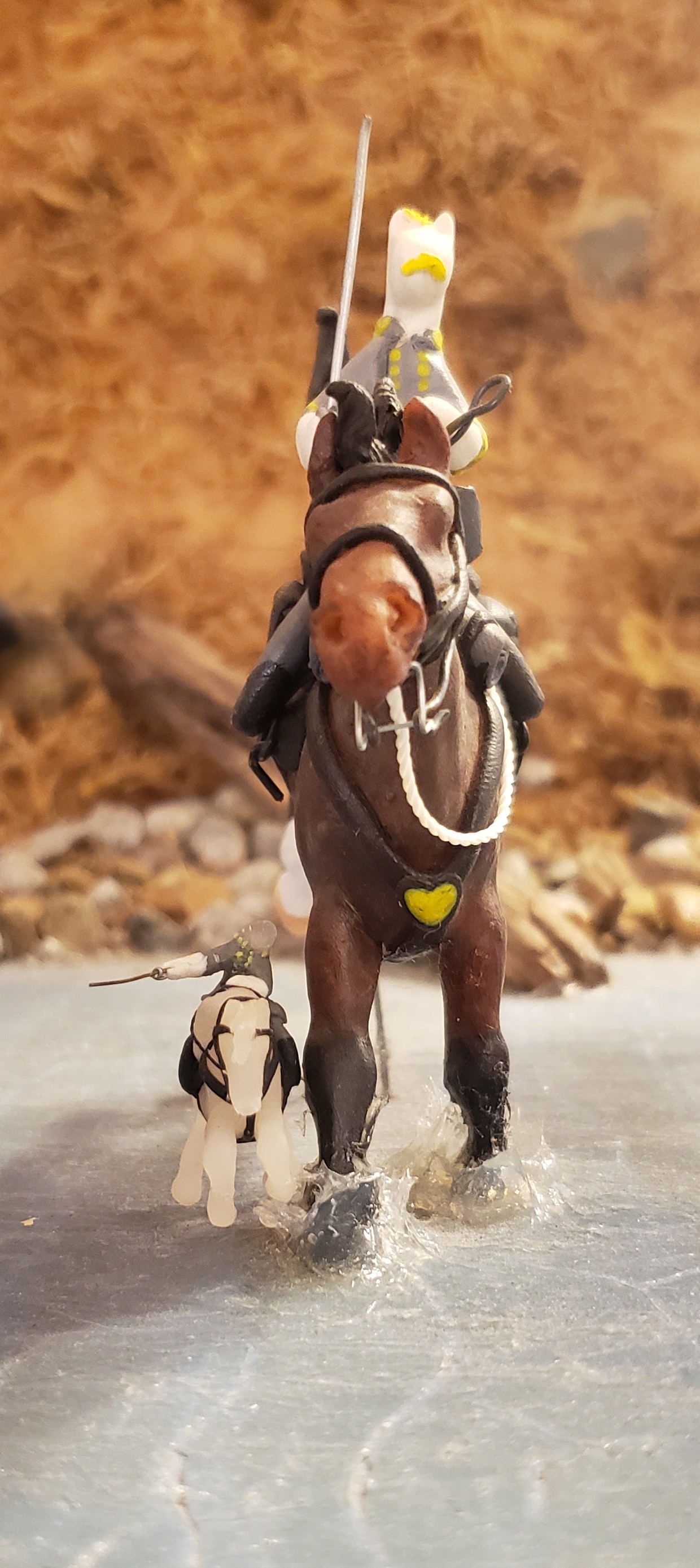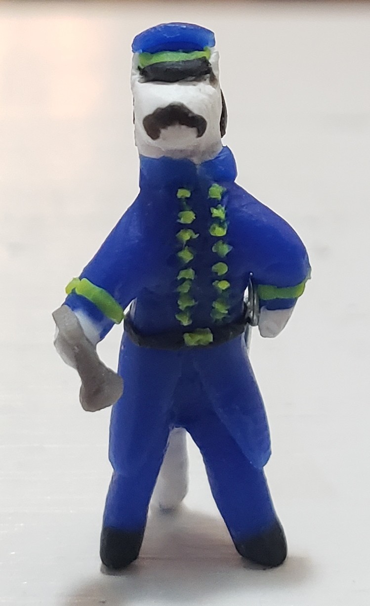 We have come a long way in our abilities in the 25 years since Cat 3K. Cat 3K is a “shrunk” cat, standing 1.5” tall. Nine months after we installed him, when we began “The Fate of Gettysburg,” 1-inch tall was the smallest we could make. The close-up of Cat 4K indicates how well we could do a “plaid” shirt at the time. Fast-forward to Cat 10K, who stands ¾-inch tall. His hailing trumpet is less than 5/32-inch long, carefully sanded to shape with a tiny file!