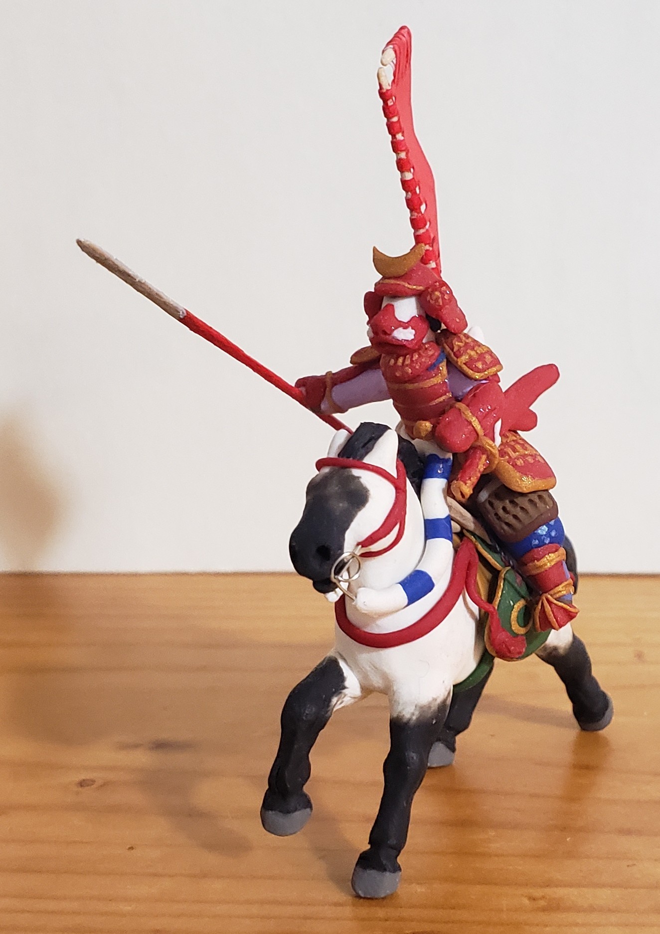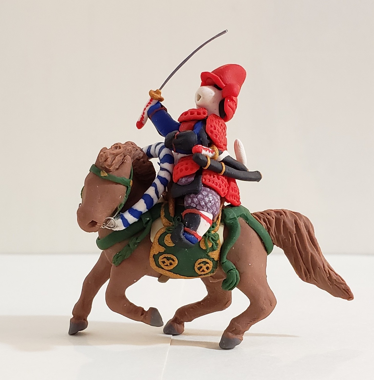 The samurai that Ruth makes for our Sekigahara display are 1.25-inch tall, made solely from colored Sculpey III (no paint) and with only a toothpick for a tool. She makes each according to the way a samurai would dress. This means that a lot of meticulously-added detail is covered up by subsequent layers!