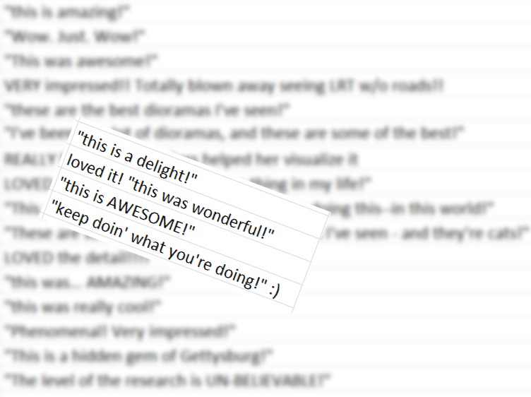 • continuing to bring us you! Word-of-mouth is a wonderful resource, and we are deeply grateful to each of you who has told (or cajoled) a family member or friend to visit us. The best parts of our work here are to see the joy it brings you, the way that our dioramas help you to piece together the history you have just learned on battlefield tours, and the way children (and adults) are inspired to create their own dioramas or to study history.