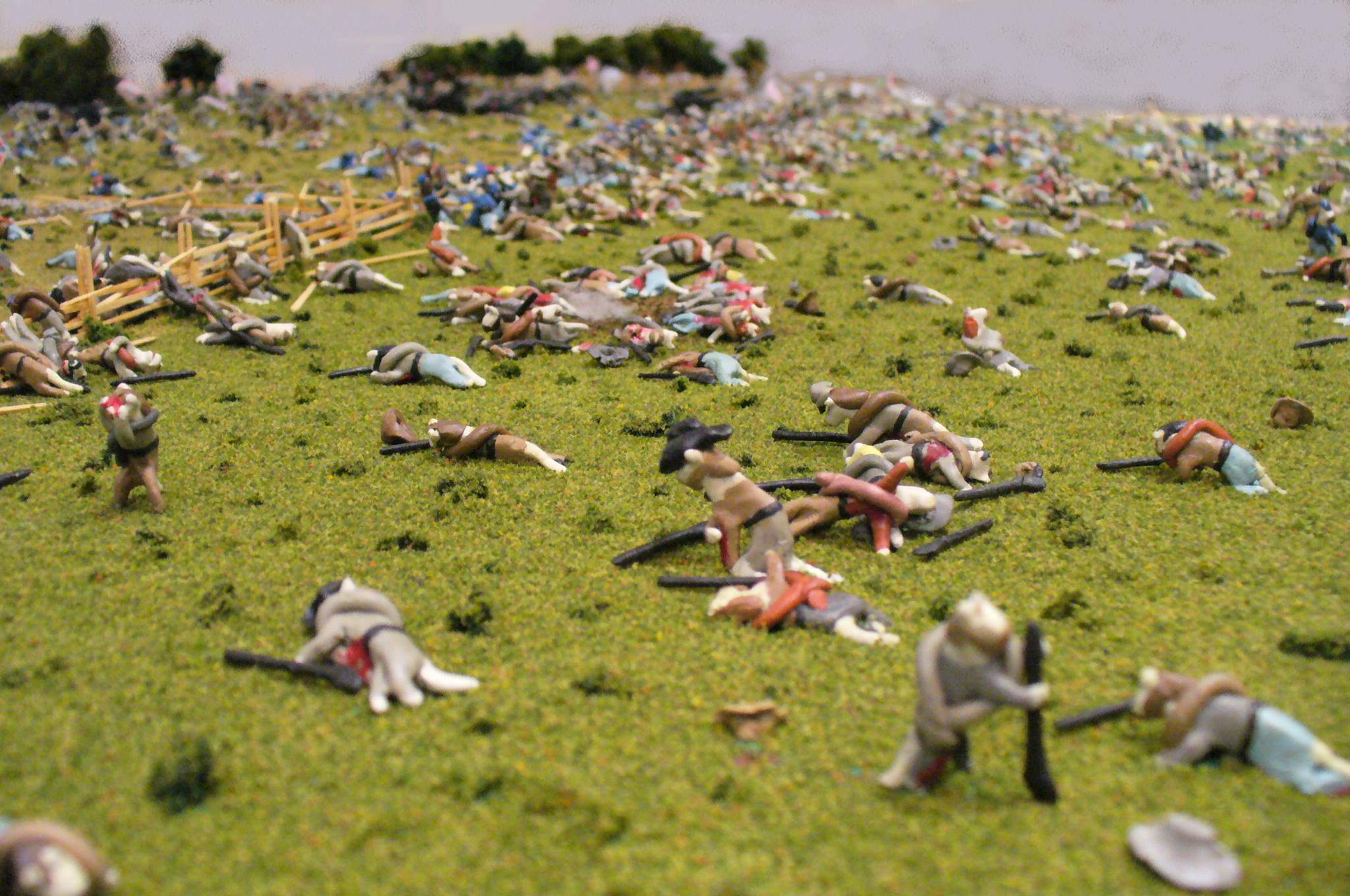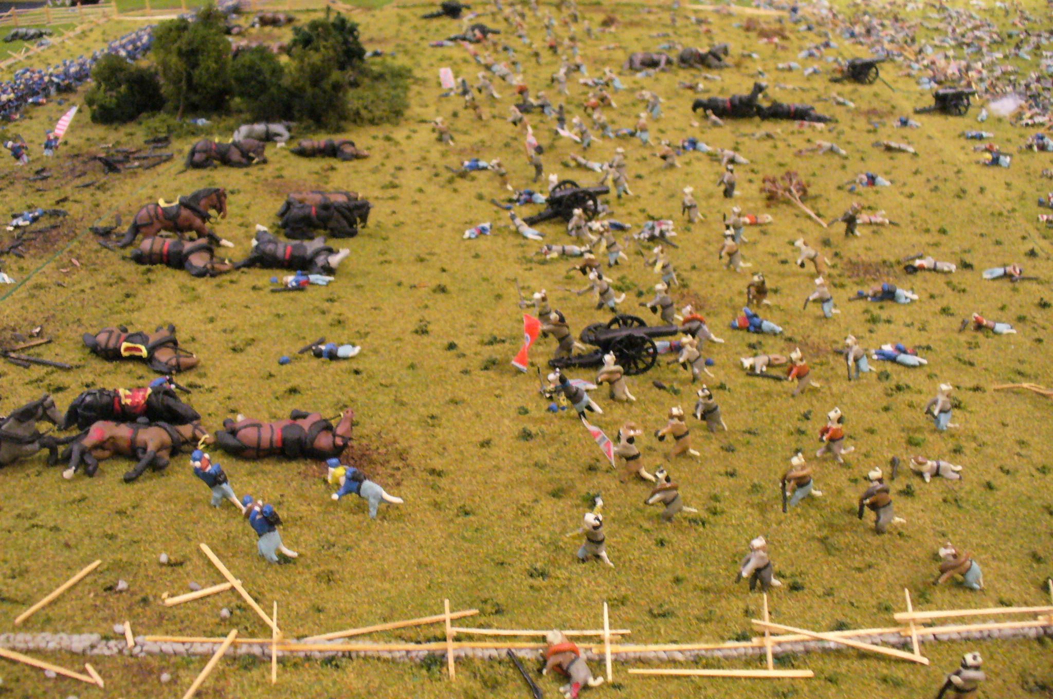 “The Fate of Gettysburg” shows the fighting at the Angle during Pickett’s Charge at Gettysburg on July 3, 1863. Begun in 2000, the diorama measures 5.5 ft. x 7.5 ft. and has 3,000 soldiers on it, as well as hand-made artillery, horses, and stone walls. And in case you are curious, yes, all the stones in the famous stone wall are individually made from clay. While other dioramas and scenes predate this one in the history of our Civil War cats, “The Fate of Gettysburg” was our first topographical diorama. Our dad encouraged and helped us to convert our Pickett’s Charge diorama from multiple miscellaneous boxes to a custom-built base with terrain specially designed according to the actual battlefield area.