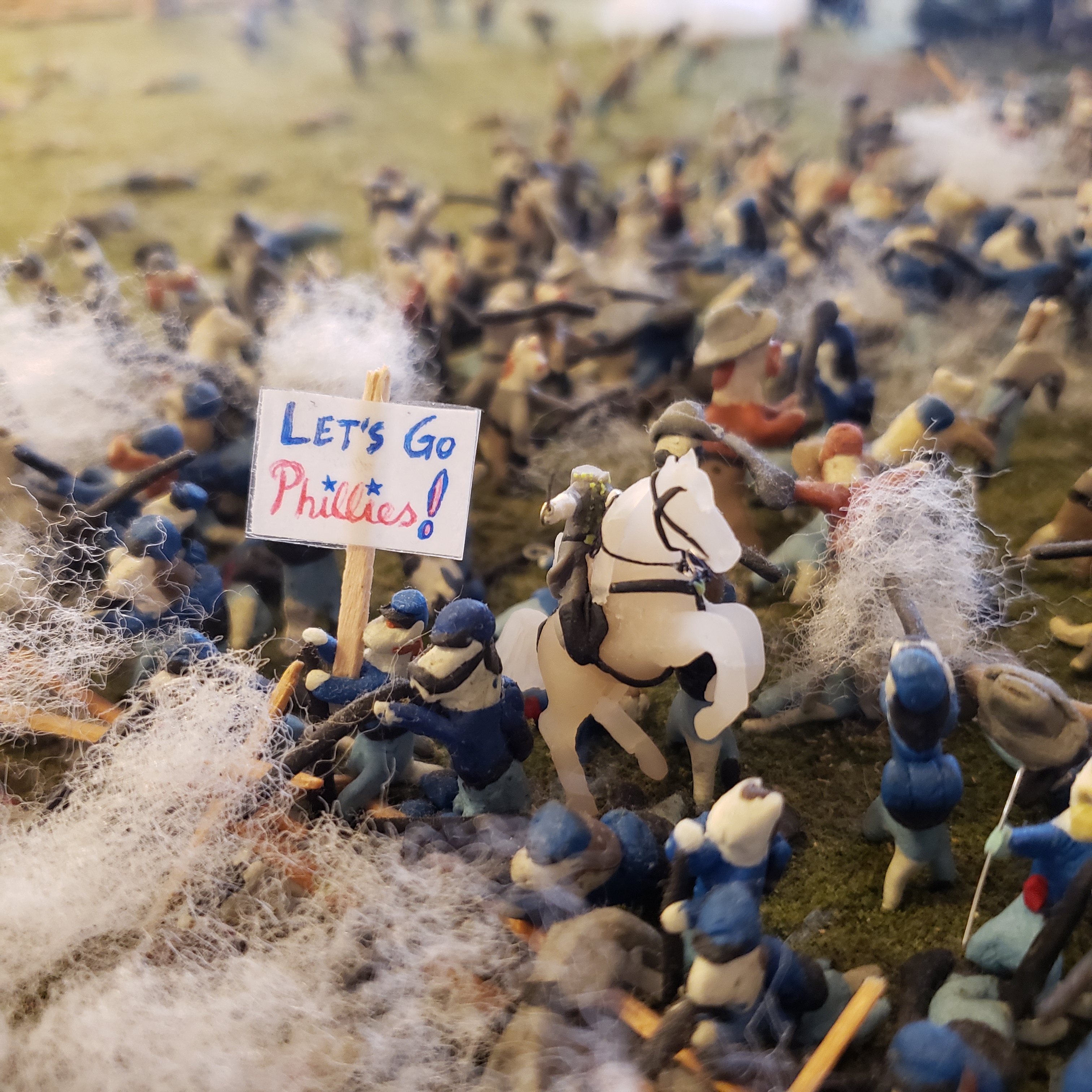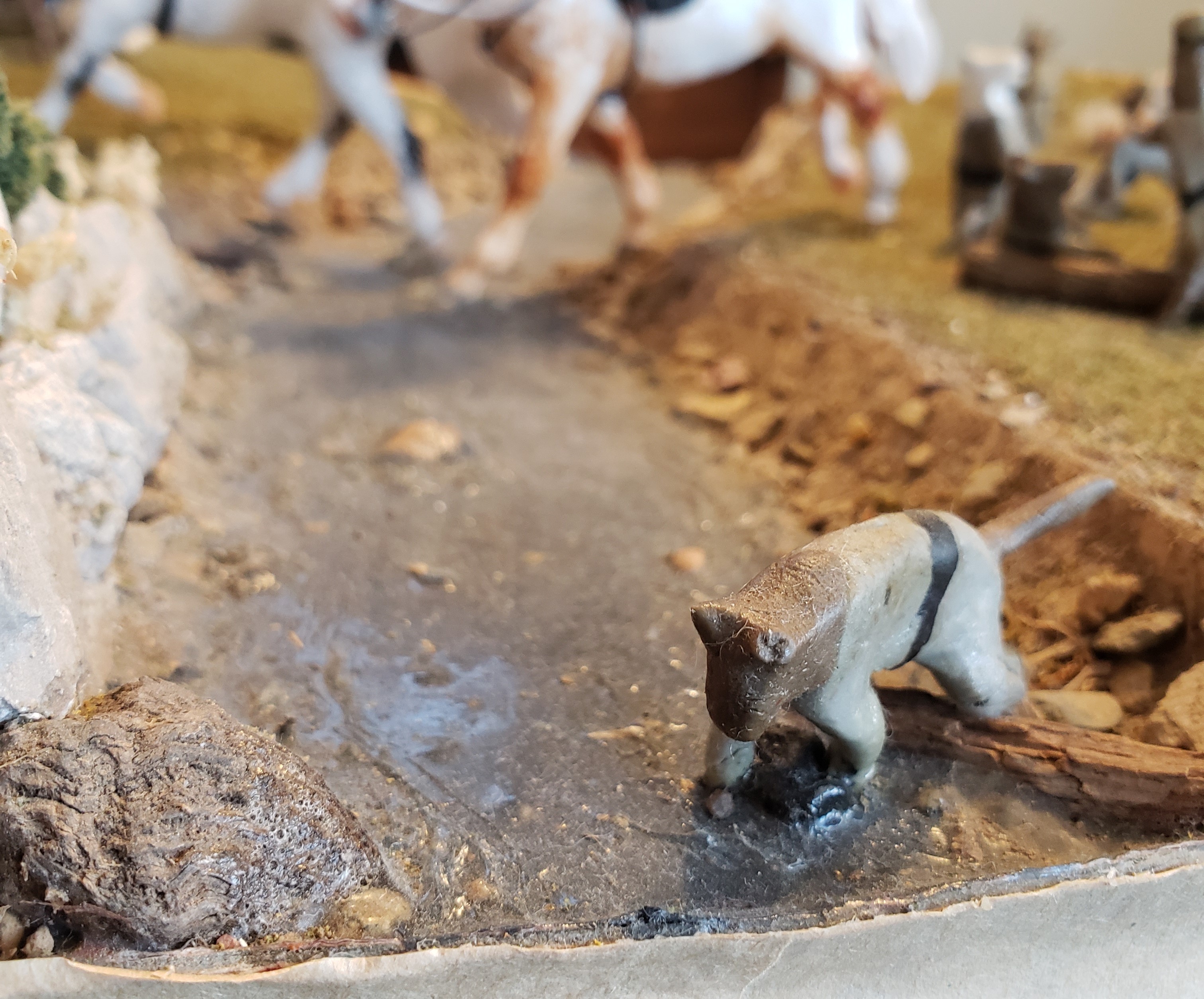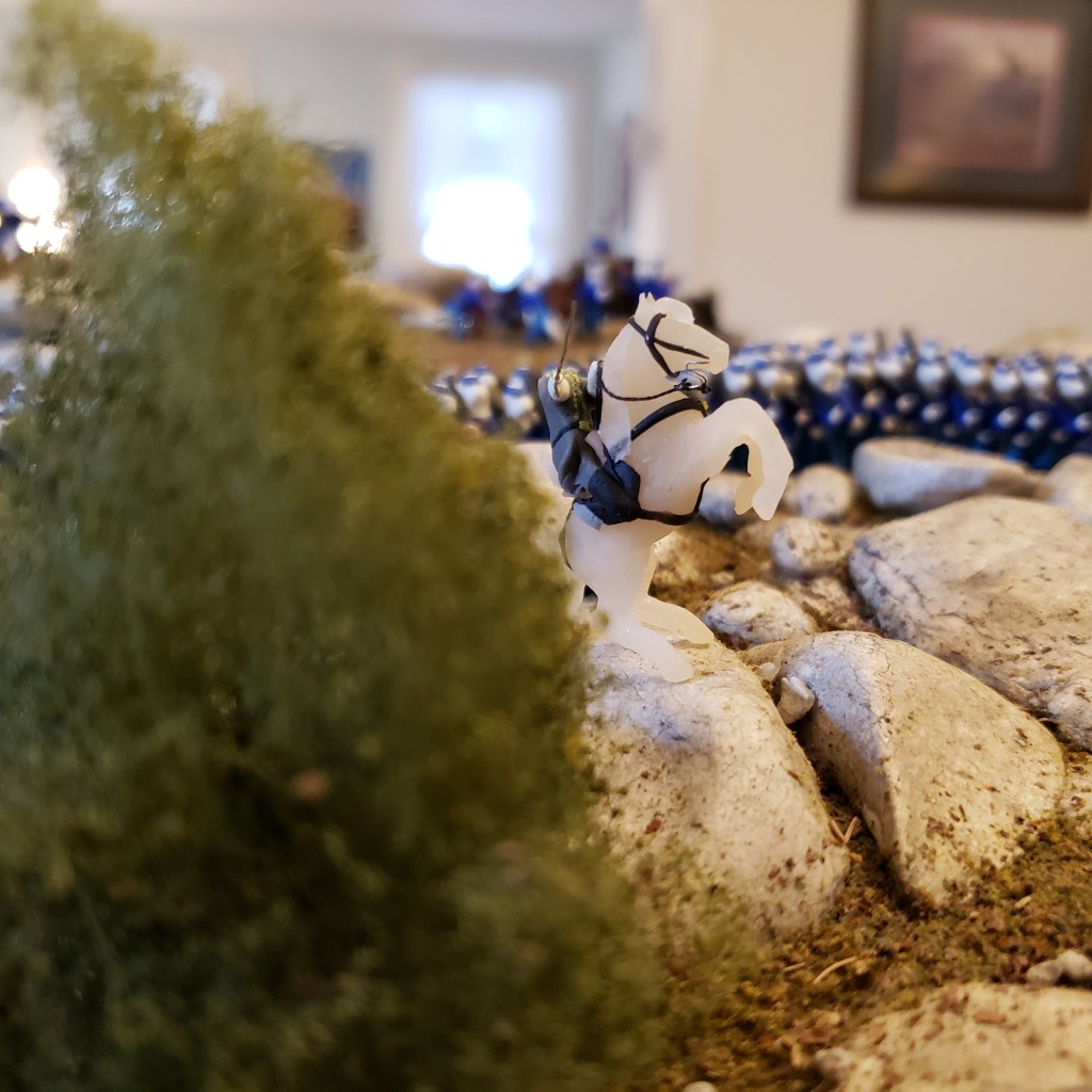 So, what began as simply adding green “turf” ended up involving adding horses, debris from exploded limbers and caissons, various colors of dried tea for kicked up dirt from shells and shot from the cannonade, Confederates along the wall and in the Copse, and more Union cats in the Copse. Even now, we still have a few more adjustments that we want to make, in order to have it more accurate.