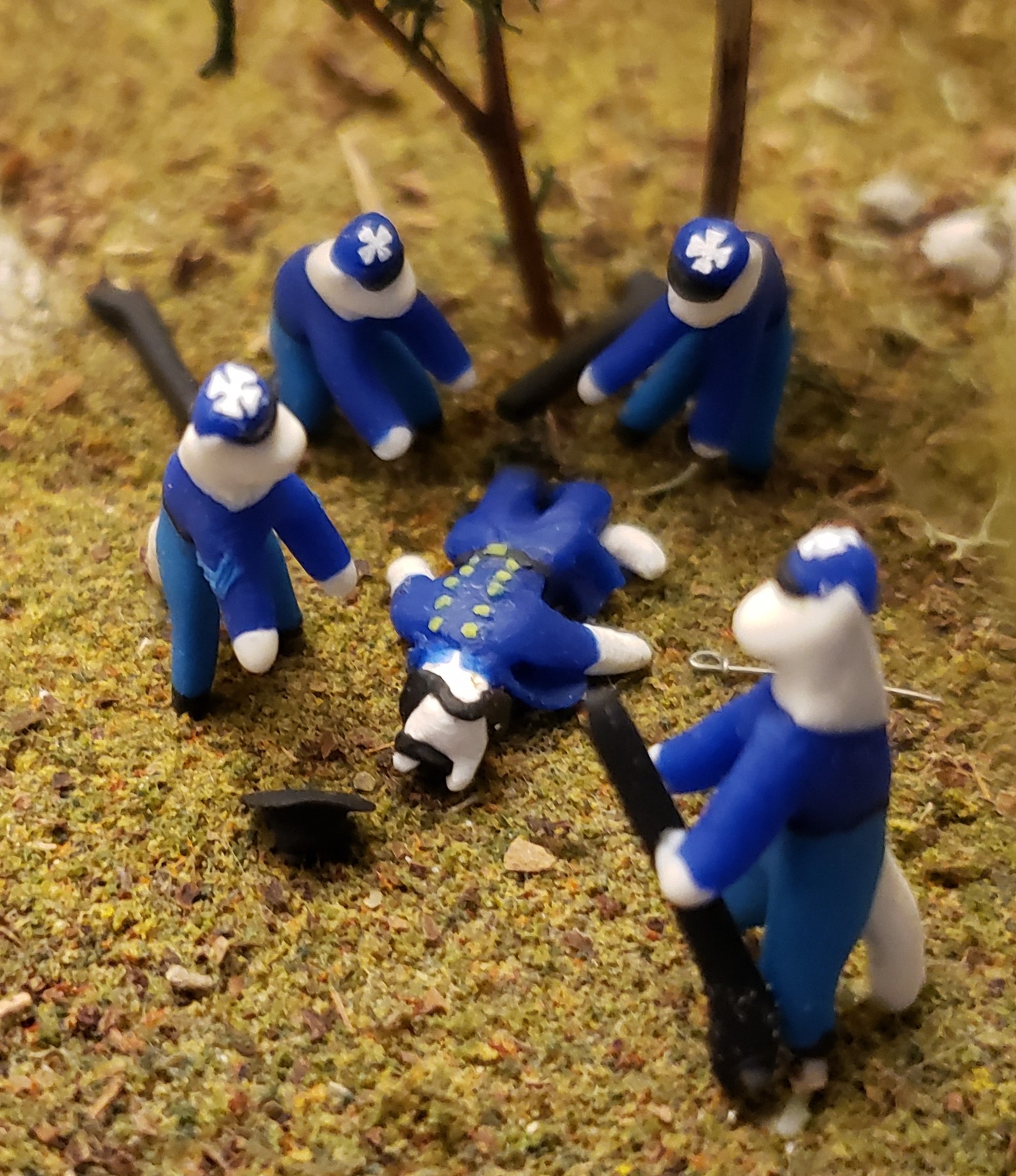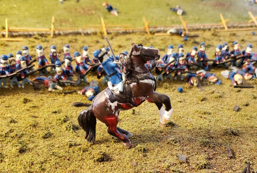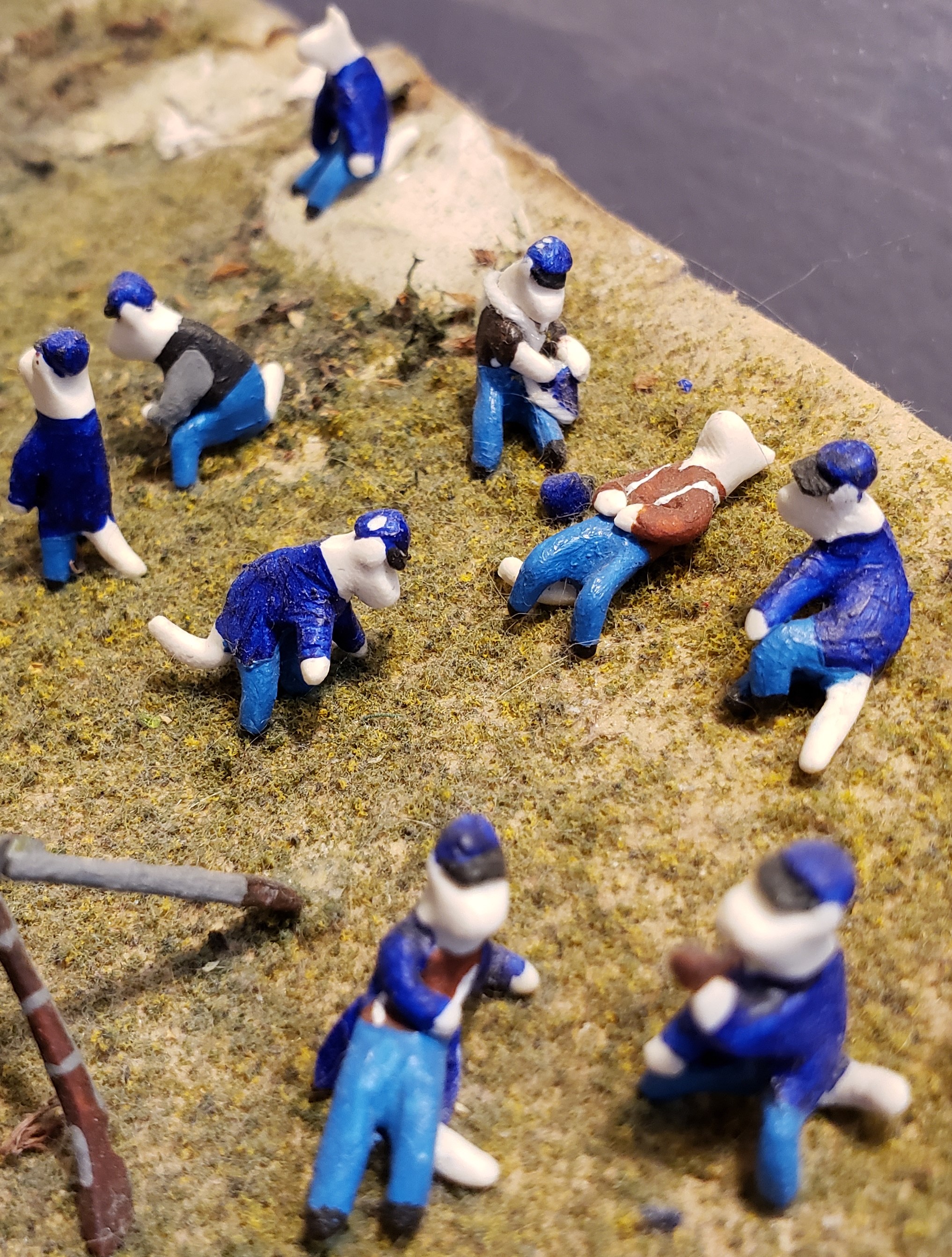 So, what began as simply adding green “turf” ended up involving adding horses, debris from exploded limbers and caissons, various colors of dried tea for kicked up dirt from shells and shot from the cannonade, Confederates along the wall and in the Copse, and more Union cats in the Copse. Even now, we still have a few more adjustments that we want to make, in order to have it more accurate.