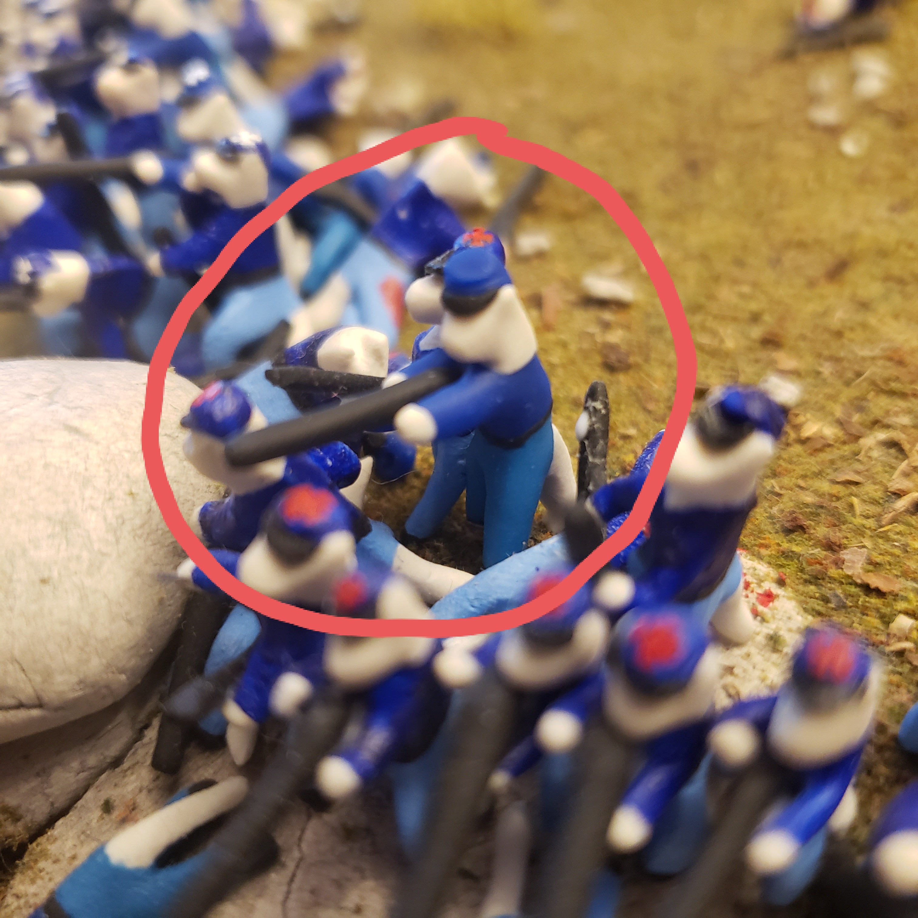 The last cat installed is one of the engineers or “sappers” working to clear a route for Hazlett’s artillery and Weed’s brigade of infantry.