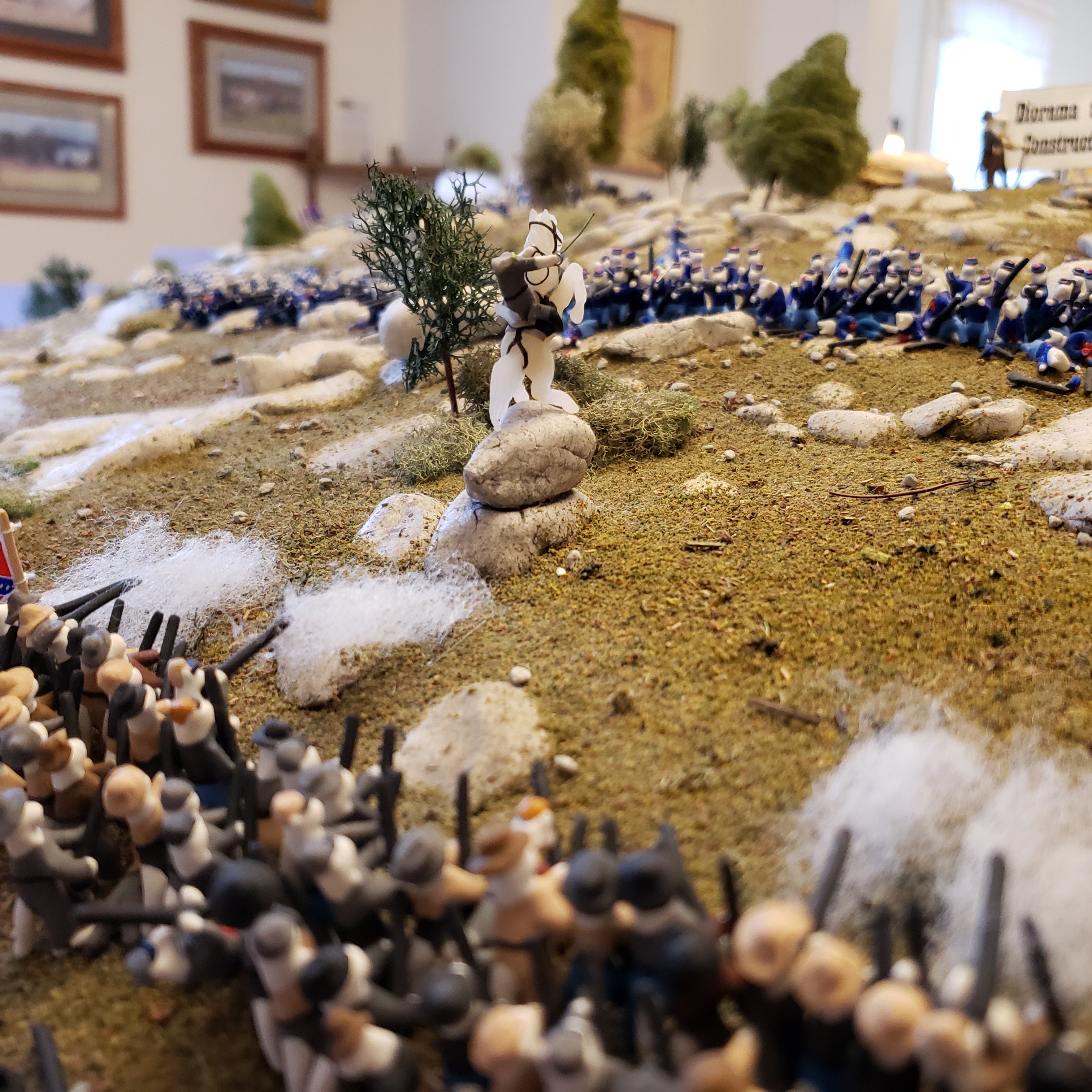 The second is a family who visited last year and bought our book. In reading it, the story of Lt. Frank Haskell’s horse, Dick, caught one child’s fascination. When they returned for a second visit, the child asked about “the horse that was wounded in the leg, and he died, but he was helping…” I immediately knew that she meant Dick, and pointed him out to her on our Pickett’s Charge diorama. On their third visit, the child still remembered Dick and looked for him again. Lt. Haskell wrote about Dick in a letter home after the battle of Gettysburg, describing how brave the horse was and how he had stayed on his feet, carrying Haskell to and fro, despite being severely wounded. Haskell finished by saying that his horse deserved a monument. There is no monument to Dick on the battlefield, but we have a little model that is telling his story to future generations!