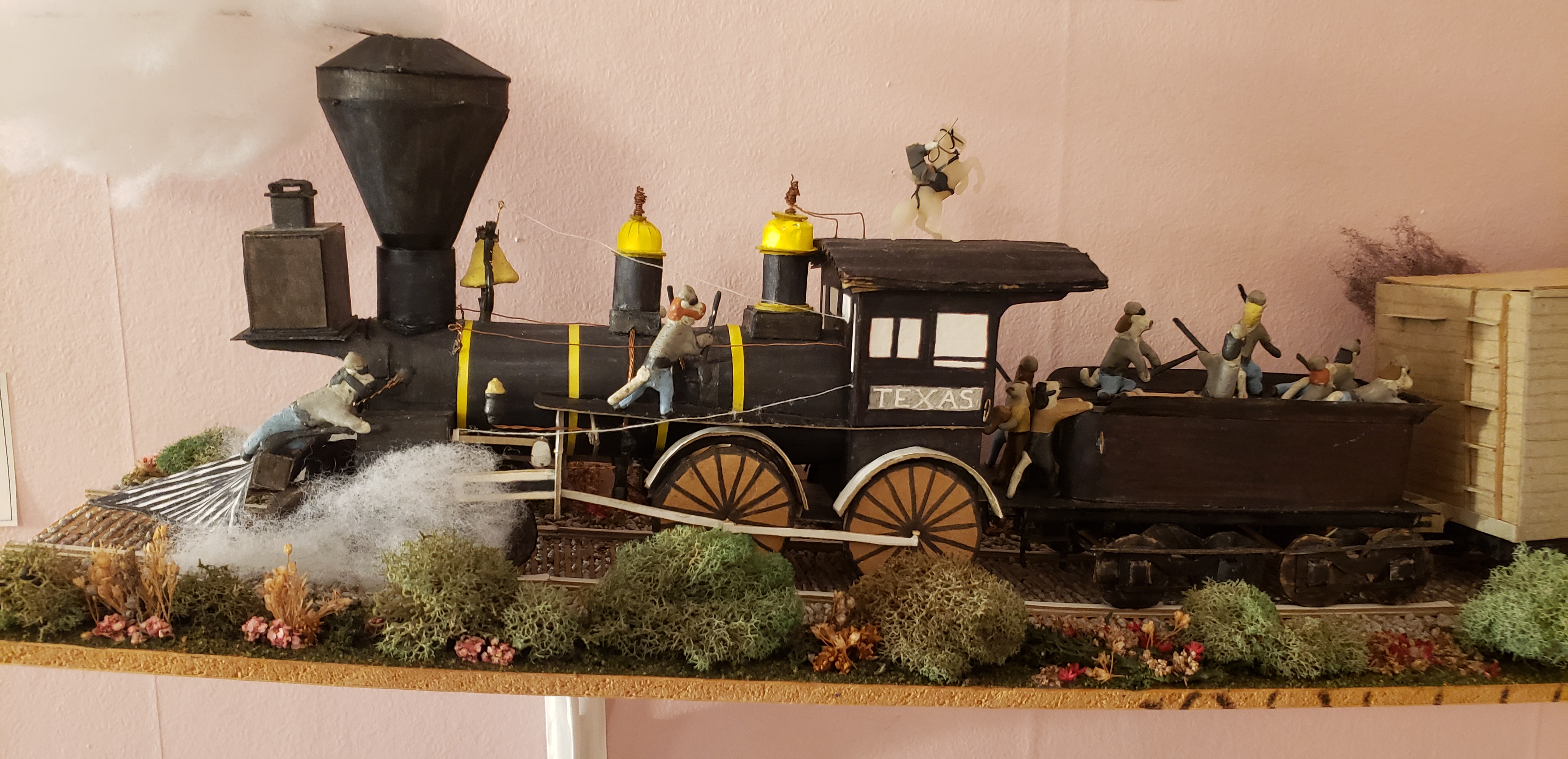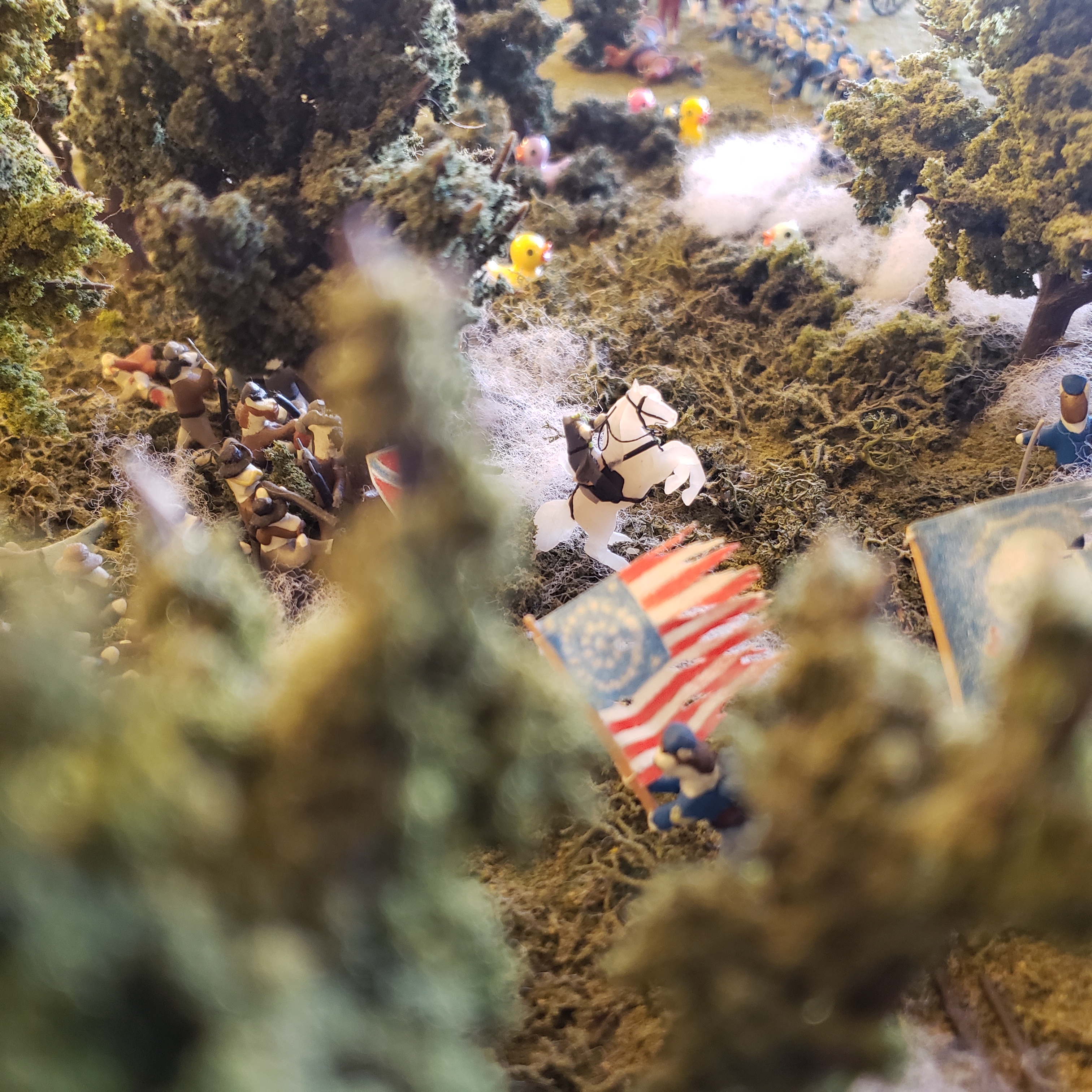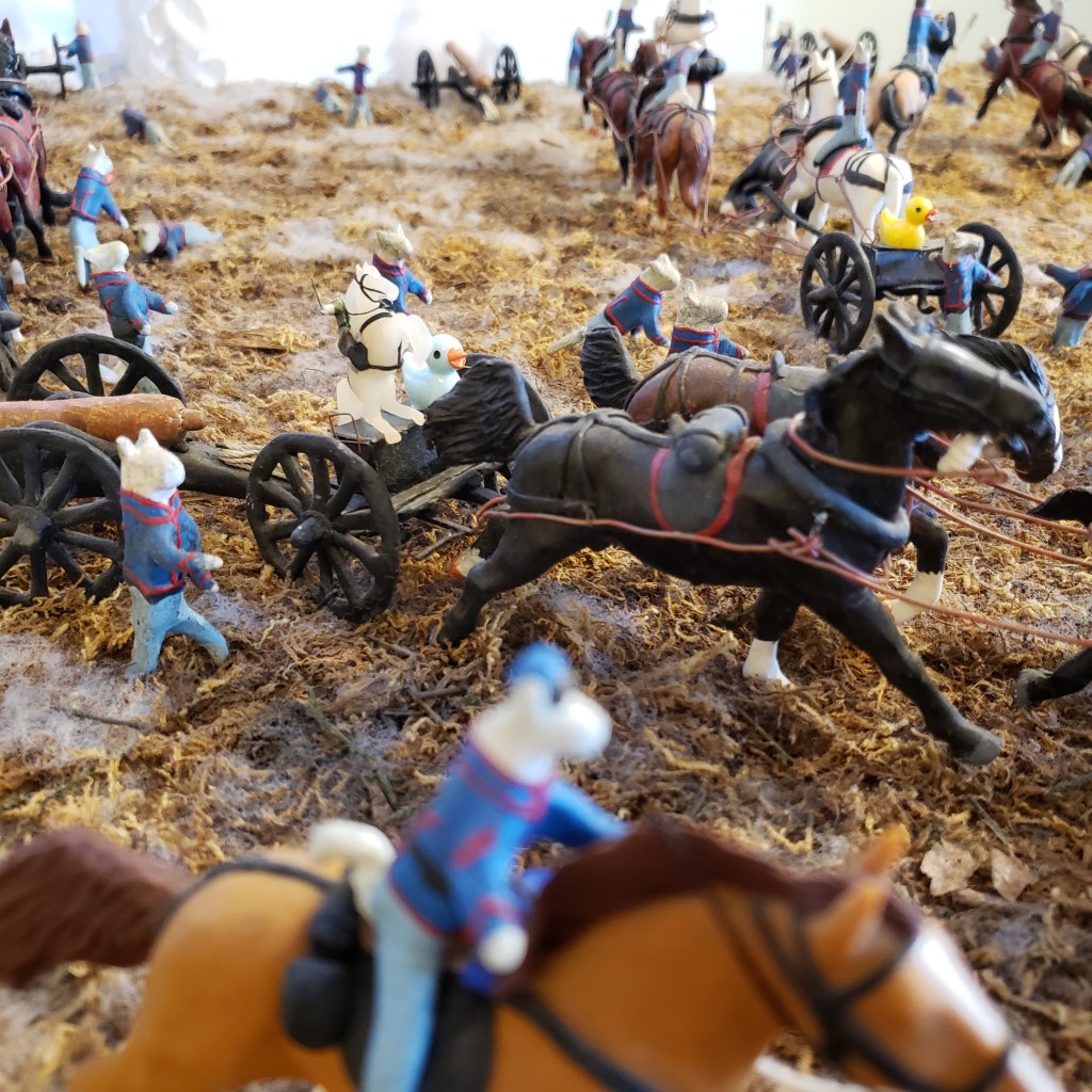 We enjoy seeing our dioramas surprise skeptical visitors. Yes, that’s right, not everyone arrives thinking they will like Civil War cats. So it is fun to hear comments like, “I thought we would be here for five minutes, and now I’m like, ‘We gotta leave??’” Over and over, the historical accuracy of our dioramas wins over the hearts of the history buffs who came in just to be supportive of a friend or family member. We very much appreciate their willingness to tag along, and then their excitement and “geeking out” over details like the ironclads or the corps badges on Little Round Top’s Yankees.