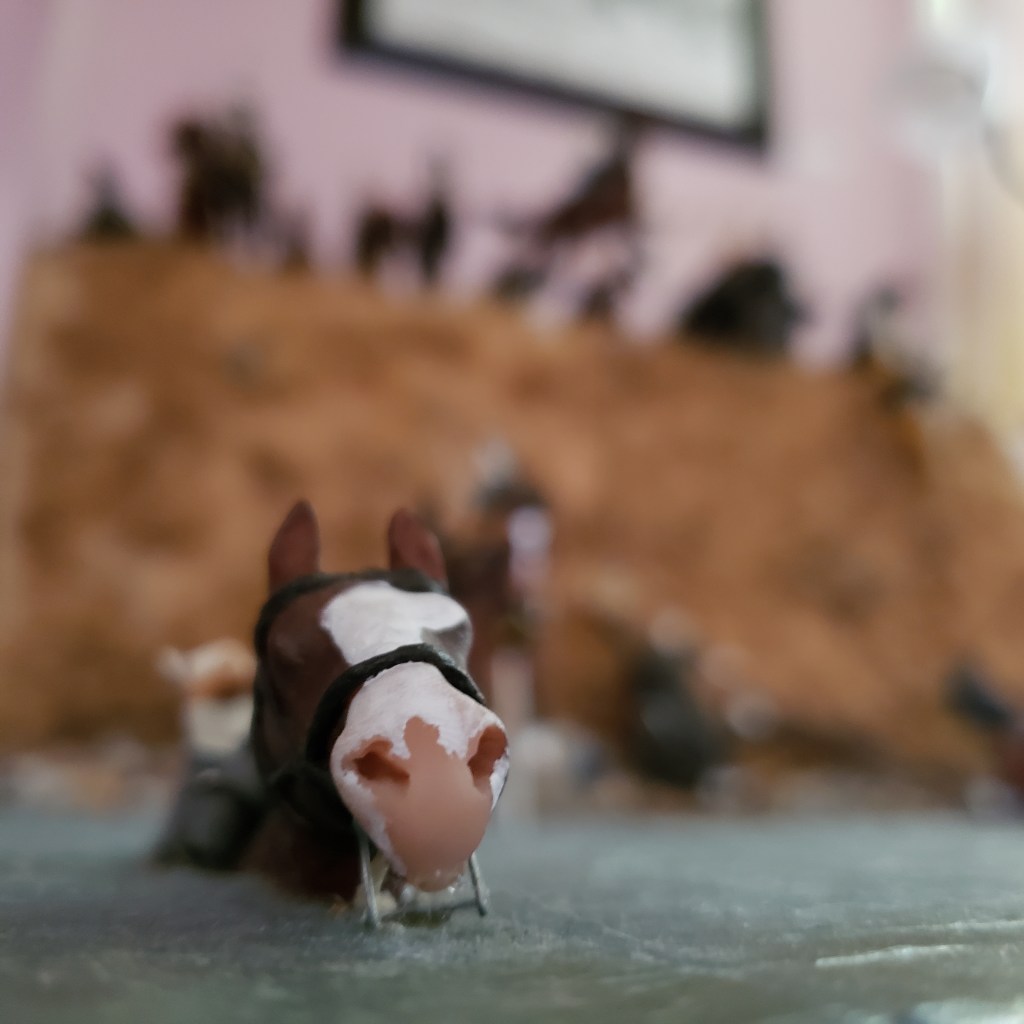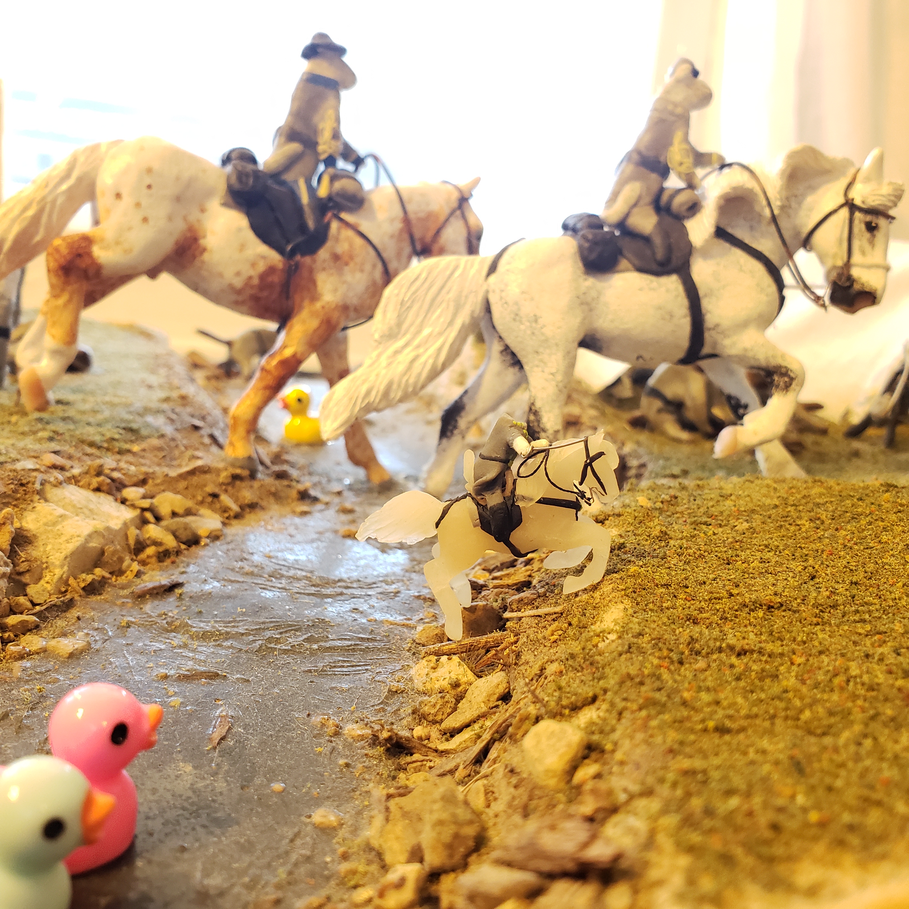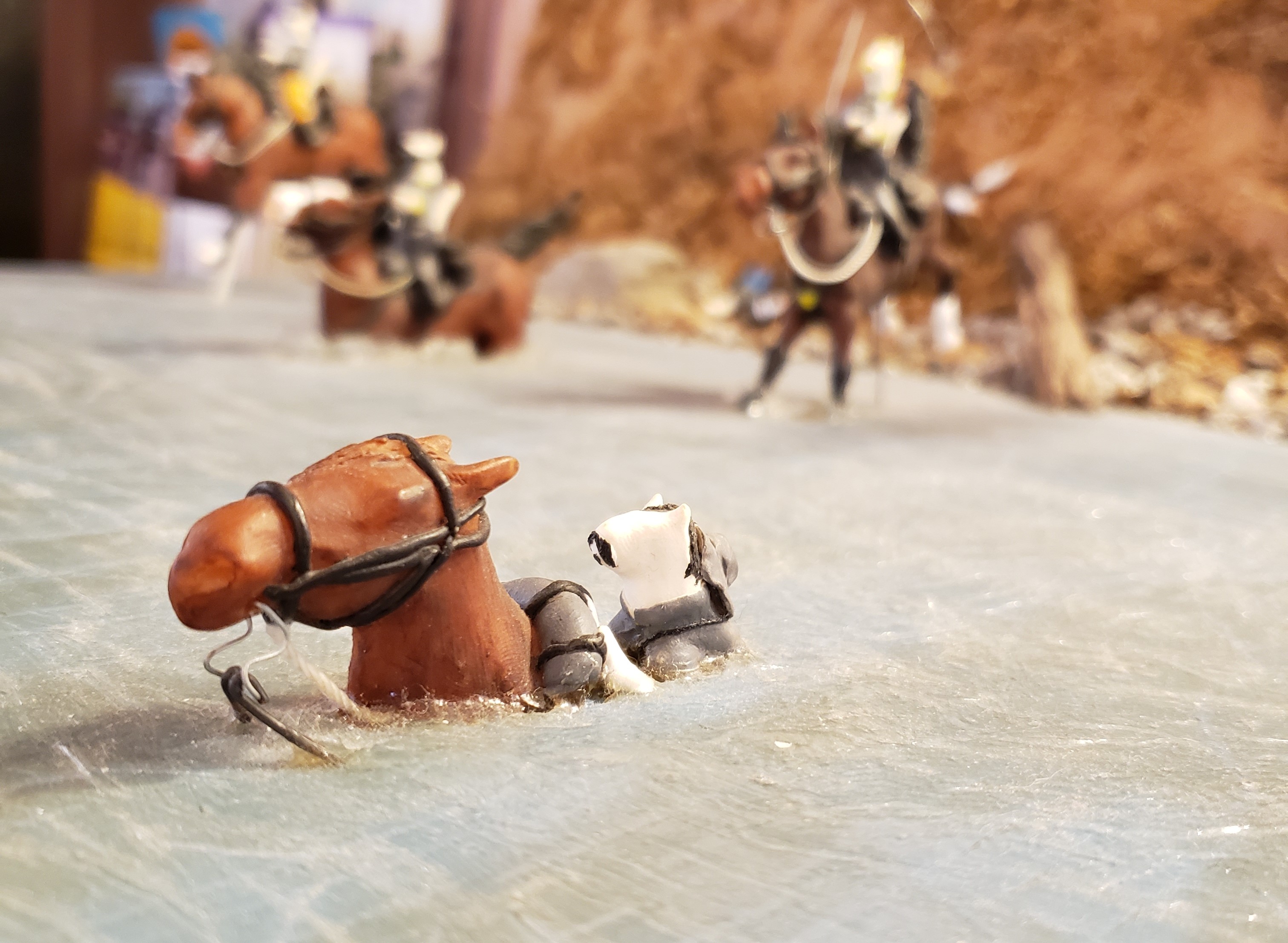 The first was a little boy, not much older than a toddler, who I happened to notice as he looked at “Desperation at Skull Camp Bridge.” He was short enough that the swimming horse’s nose was right at his own nose level. He stood for the longest time, unmoving, mouth agape, nose to nose with the horse, just looking at him, and then just looking at Gen. Wheeler’s horse, also at eye-level. It was one of the cutest things I have ever seen—a little kid, too young to understand history and facts, completely fascinated by a couple of little Sculpey horses, on his eye-level, looking back at him.