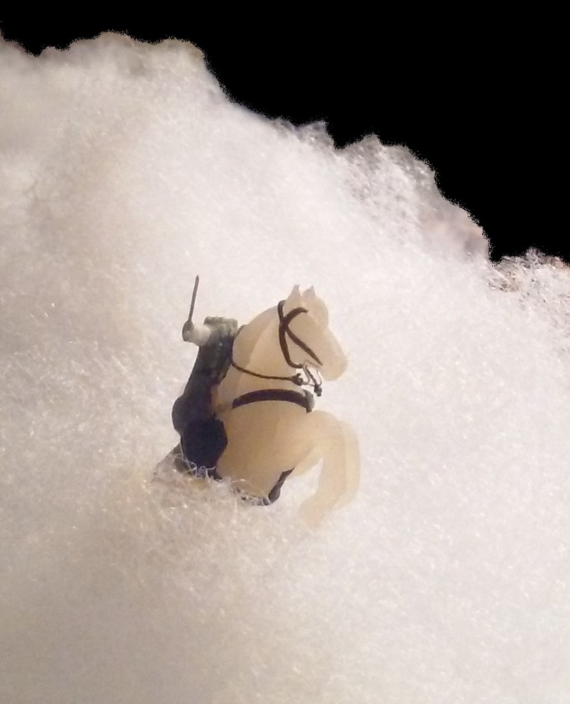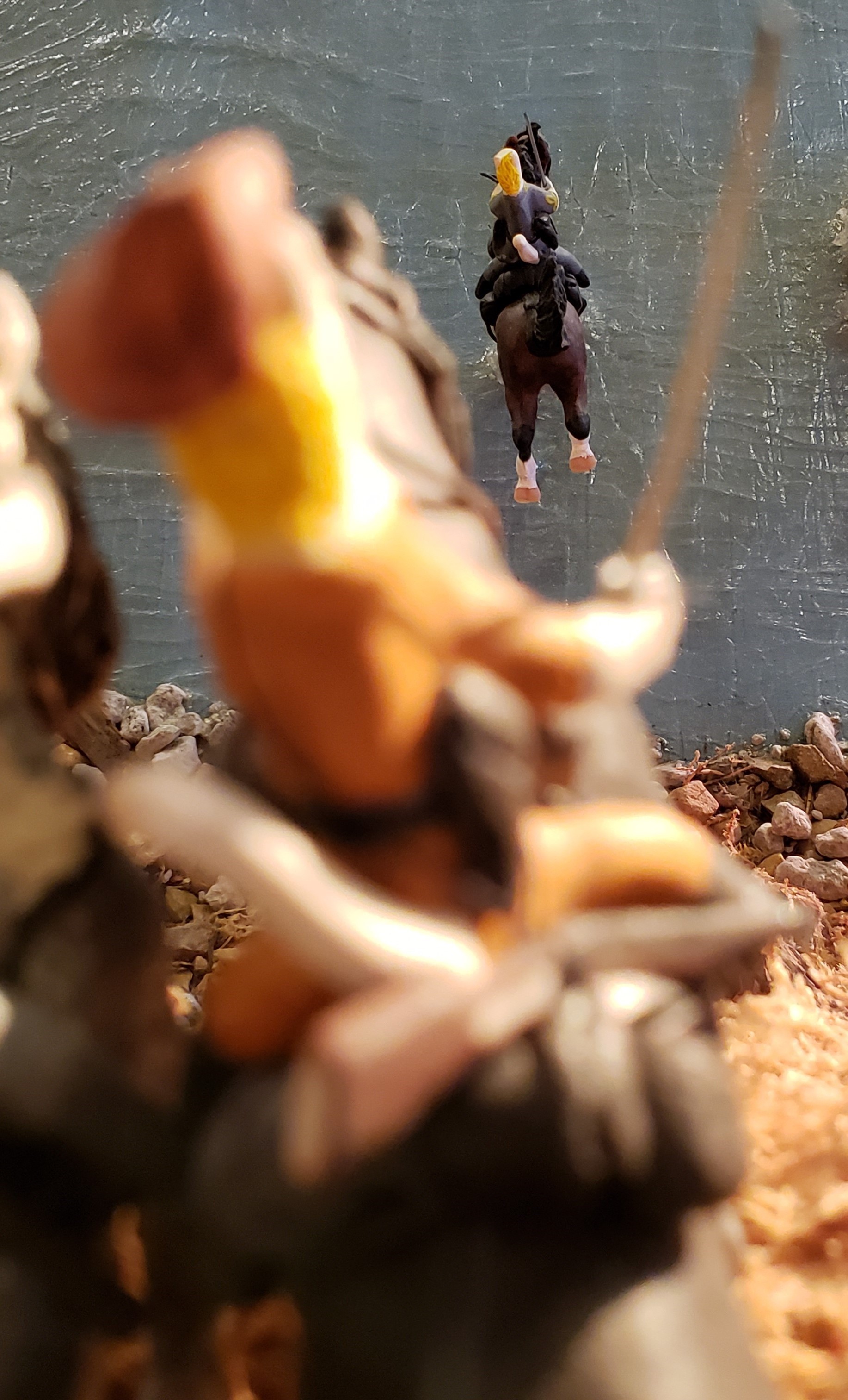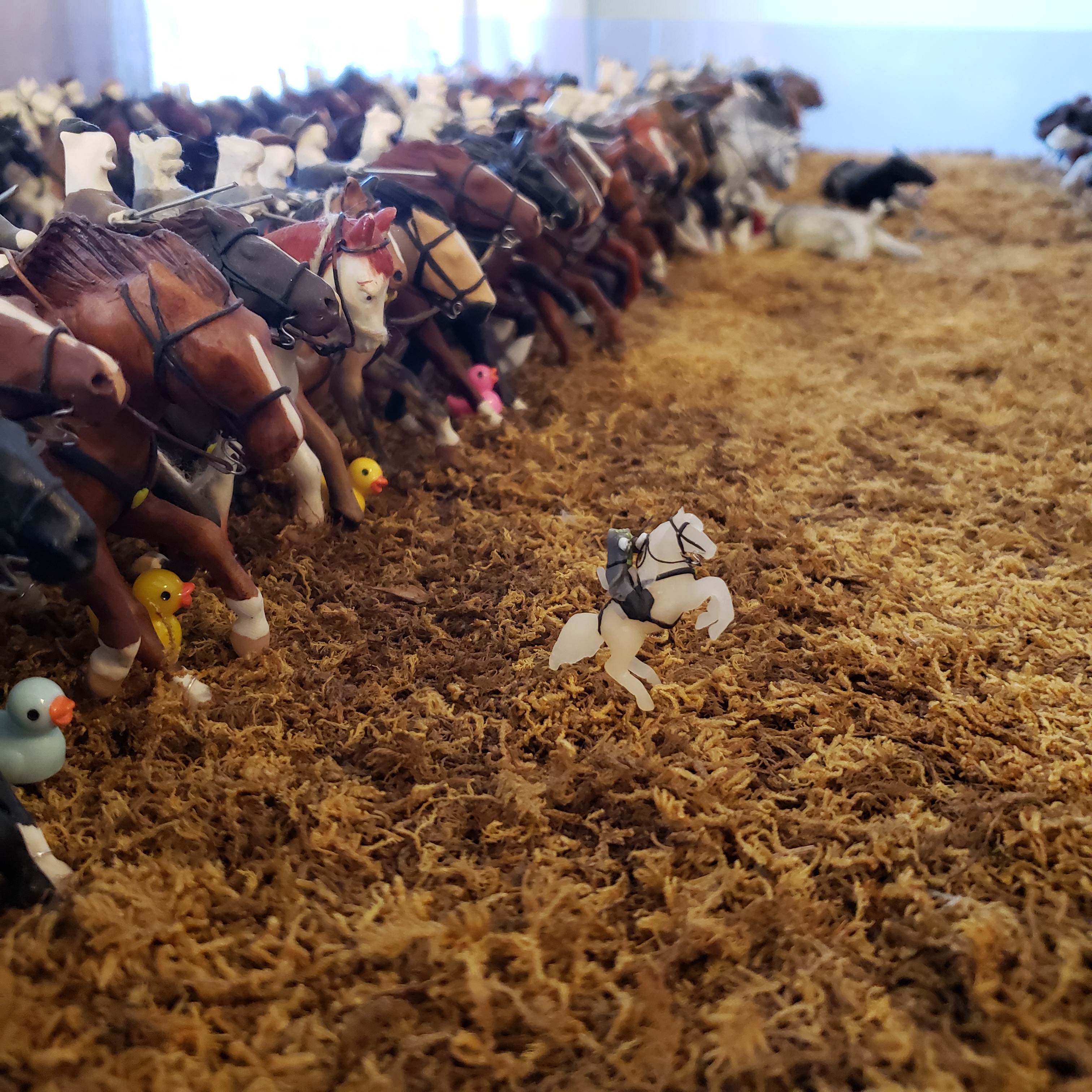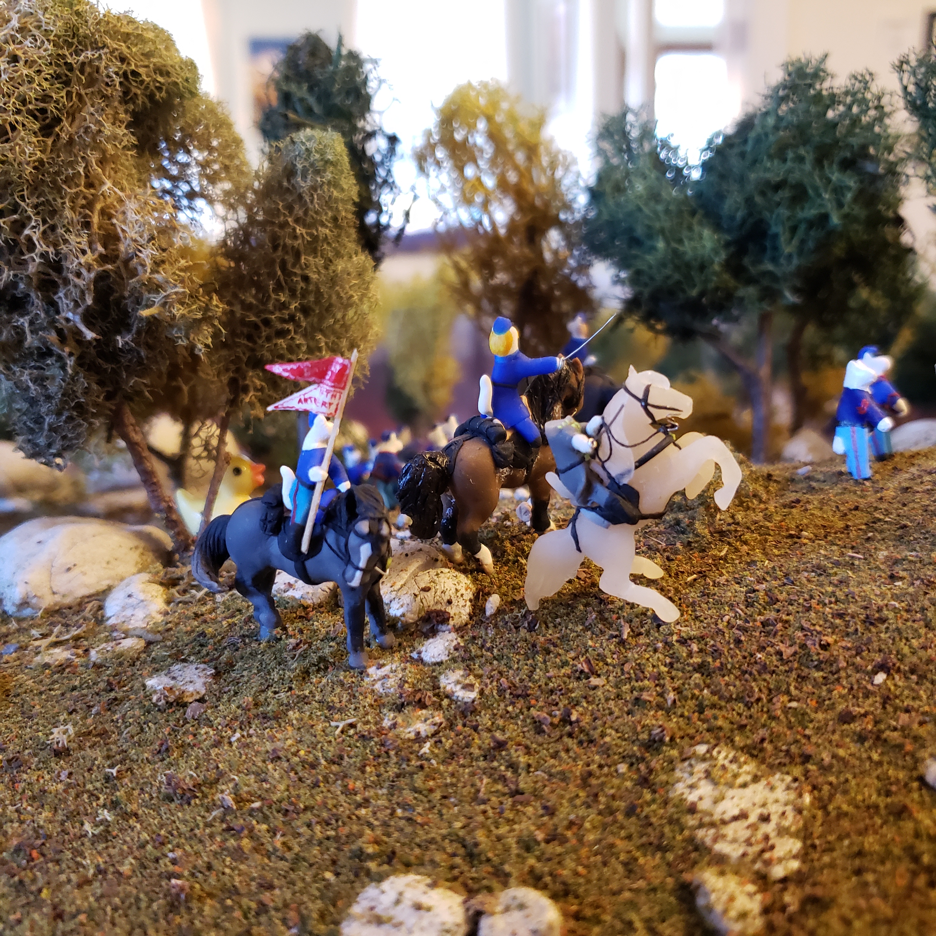 The first was a little boy, not much older than a toddler, who I happened to notice as he looked at “Desperation at Skull Camp Bridge.” He was short enough that the swimming horse’s nose was right at his own nose level. He stood for the longest time, unmoving, mouth agape, nose to nose with the horse, just looking at him, and then just looking at Gen. Wheeler’s horse, also at eye-level. It was one of the cutest things I have ever seen—a little kid, too young to understand history and facts, completely fascinated by a couple of little Sculpey horses, on his eye-level, looking back at him.