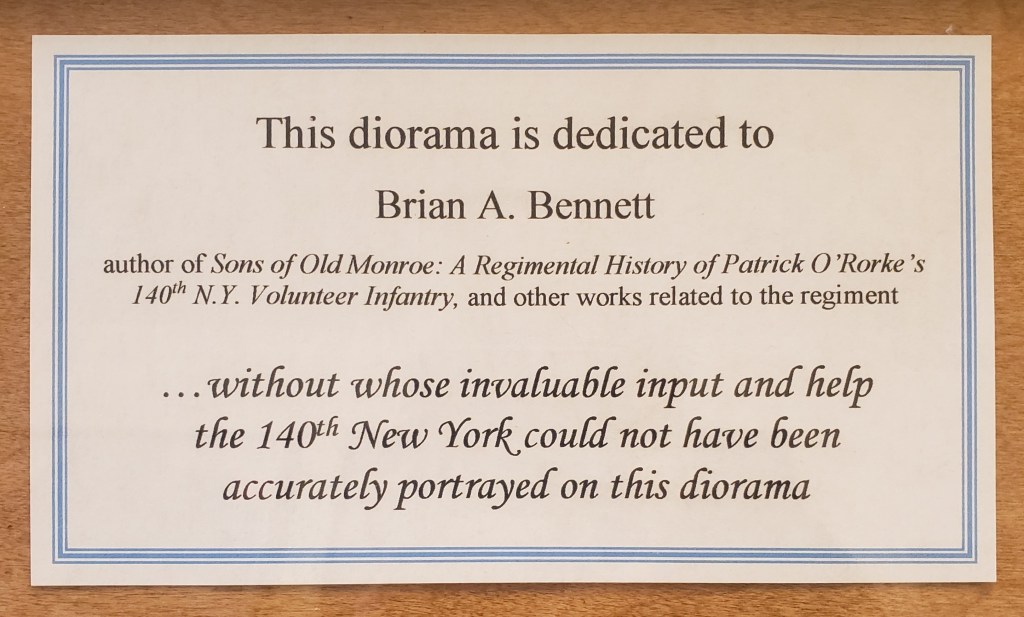 And then we found Mr. Bennett’s work. By reconciling soldiers’ first-hand accounts, he has reached a very clear picture of what Col. O’Rorke, Adj. Farley, and the regiment most likely did. Not only has he written articles and a regimental history for the 140th New York, but he graciously supplied us with the first-hand accounts and his own writings, and answered our questions. We cannot thank him enough for his help. “Invaluable” only scratches the surface.