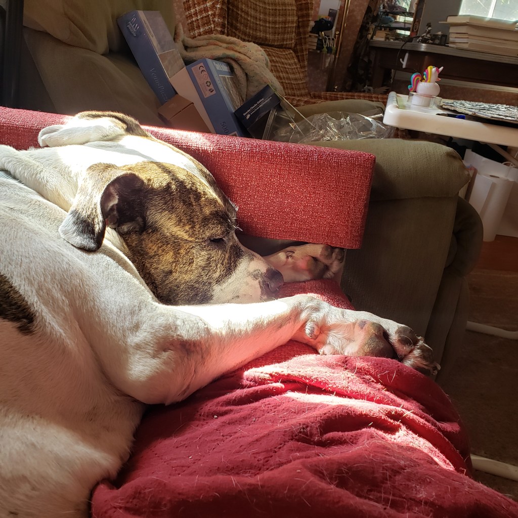 I feel a little silly writing to you. I feel like I already got my Christmas presents. I have a really nice home, with more toys than I know what to do with, and lots of blankets and beds. I get a chomp treat every day, too. My home came with an amazing sofa. I didn’t know what a sofa was or how to get onto it, but I learned quickly. It’s such a nice bed! It’s perfect for rolling on and squishing my face into! My hoomans tell me, “Watch out! You’ll roll off!” but I don’t know what that means. Sometimes I end up on the floor and I don’t know what happened, but I just jump back on. It makes my hoomans laugh, so that makes me happy.